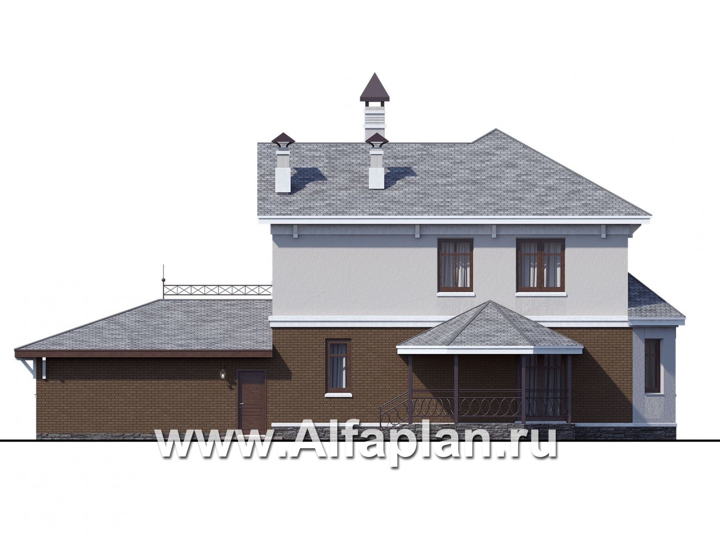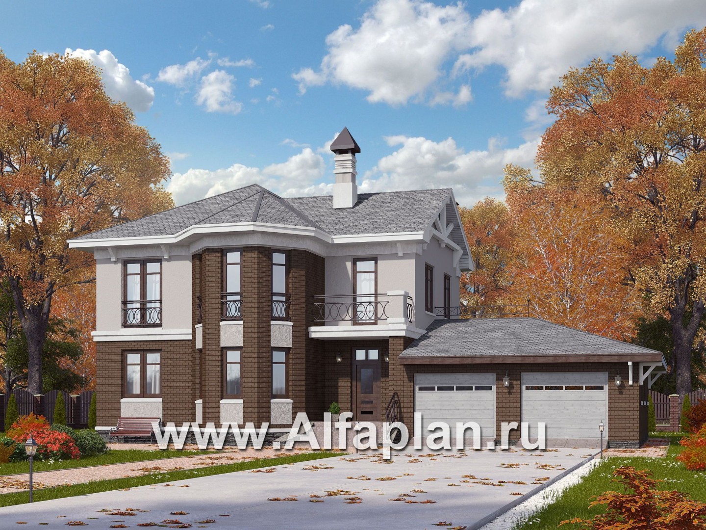 Двухэтажный загородный дом с массивным эркером и гаражом для двух автомобилей привлечет внимание заказчиков, стремящихся построить дом, не подвластный веяниям быстротечной моды.  Его "спокойная" архитектура,  классические элементы декора: карнизы, кронштейны, решетки ограждений создают ощущение стабильности и незыблемости  традиций.  Несомненным украшением главного фасада является эркер, проходящий  через оба этажа. Большие вертикальные  окна прекрасно освещают внутренние помещения. Главный вход находится  в левой  части  строения. Ступеньки входа и цоколь дома отделаны  облицовочным камнем.