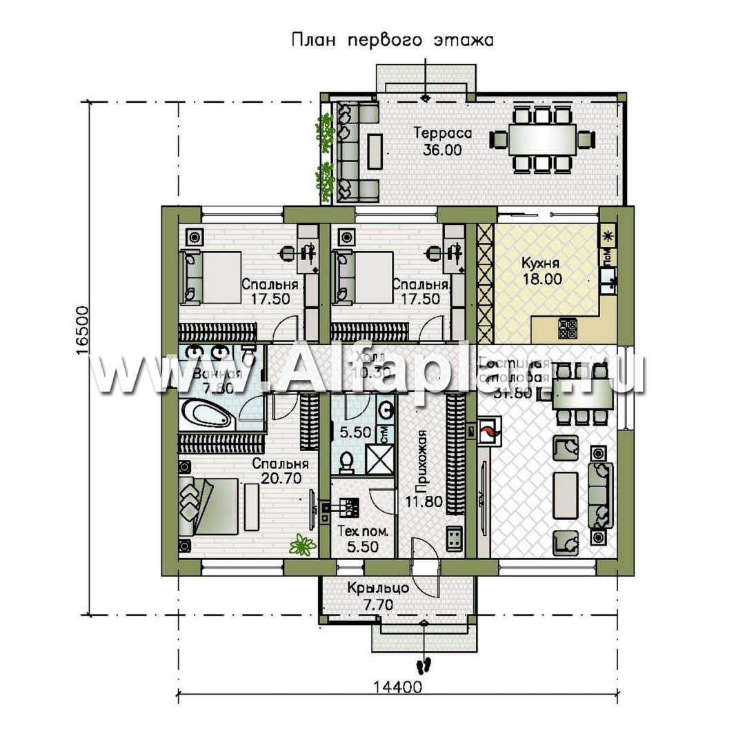 «Стрелец» -проект современного одноэтажного дома с террасой со стороны входа, с односкатной крышей - технические характеристики