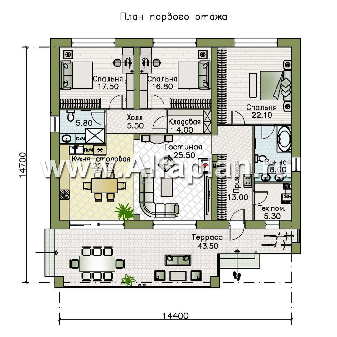 «Аметист» - проект одноэтажного дома, с террасой со стороны входа, 3 спальни, в стиле барн - технические характеристики
