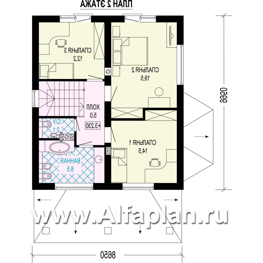 Второй этаж проекта дома оснащен тремя зонами отдыха в виде просторных спальных комнат. Здесь могут разместиться как члены семьи, там и гости. Вместительная ванная – еще одно достоинство верхнего этажа.