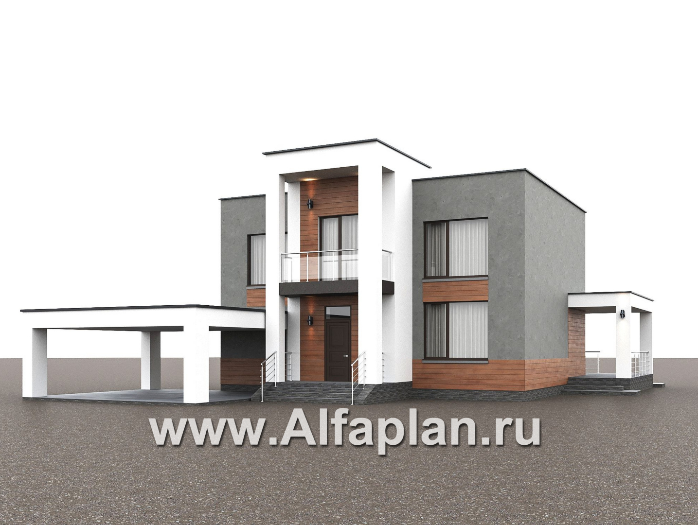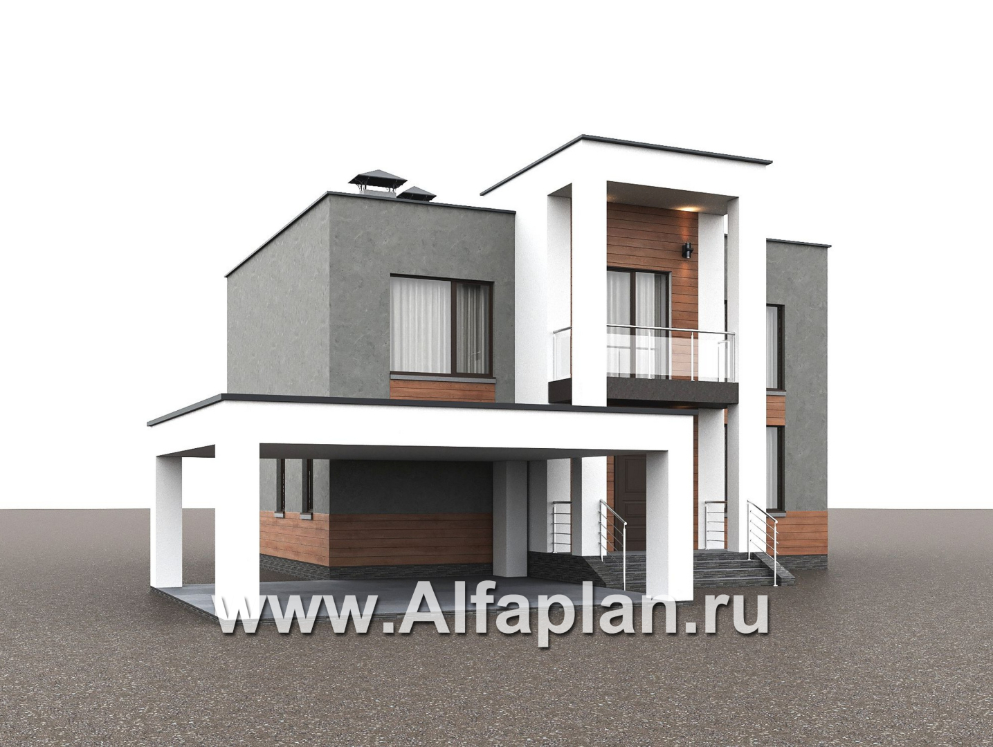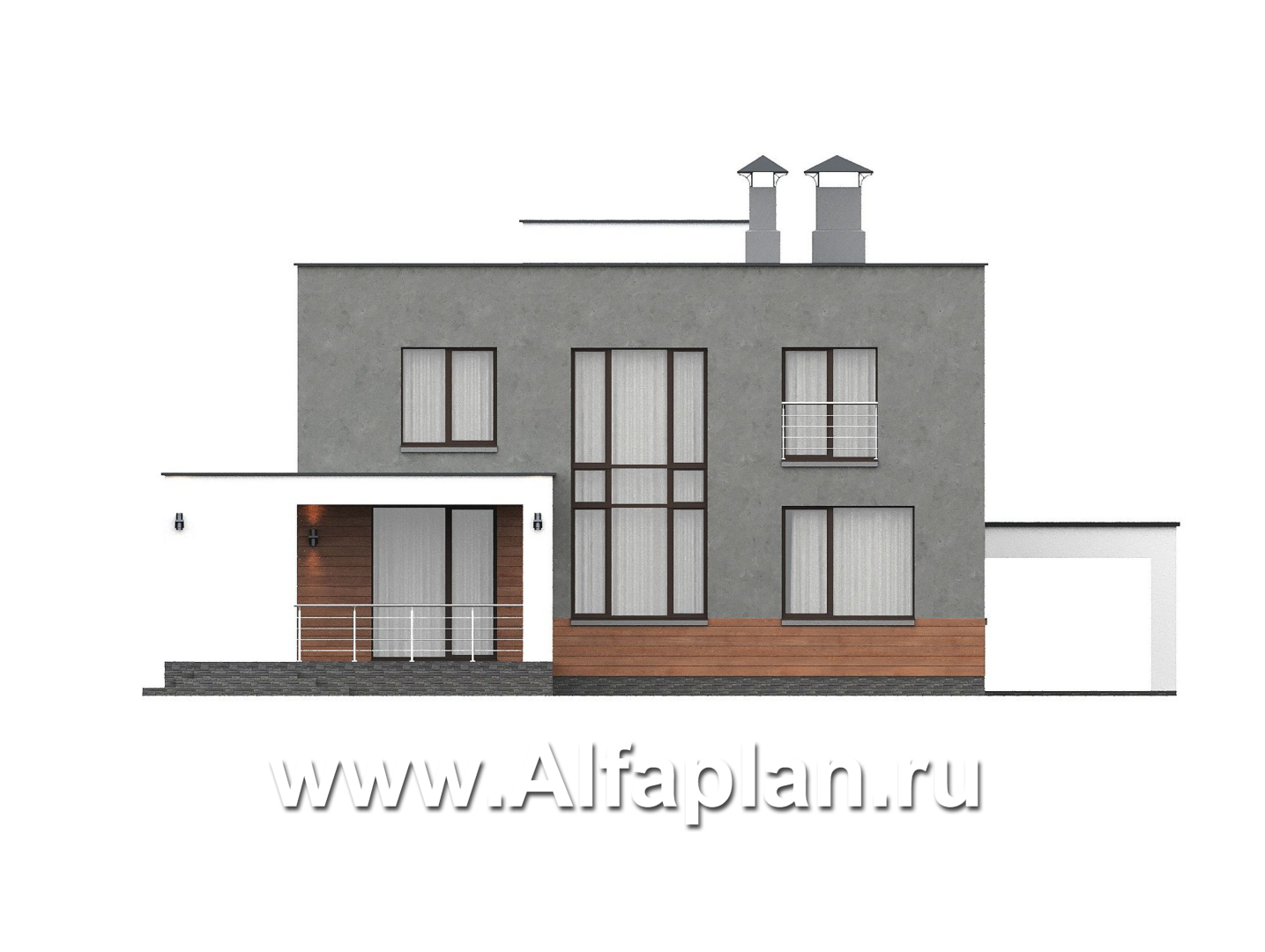 «Вермеер» - проект двухэтажного дома, планировка с мастер спальней, со вторым светом и с террасой, в стиле минимализм с плоской крышей