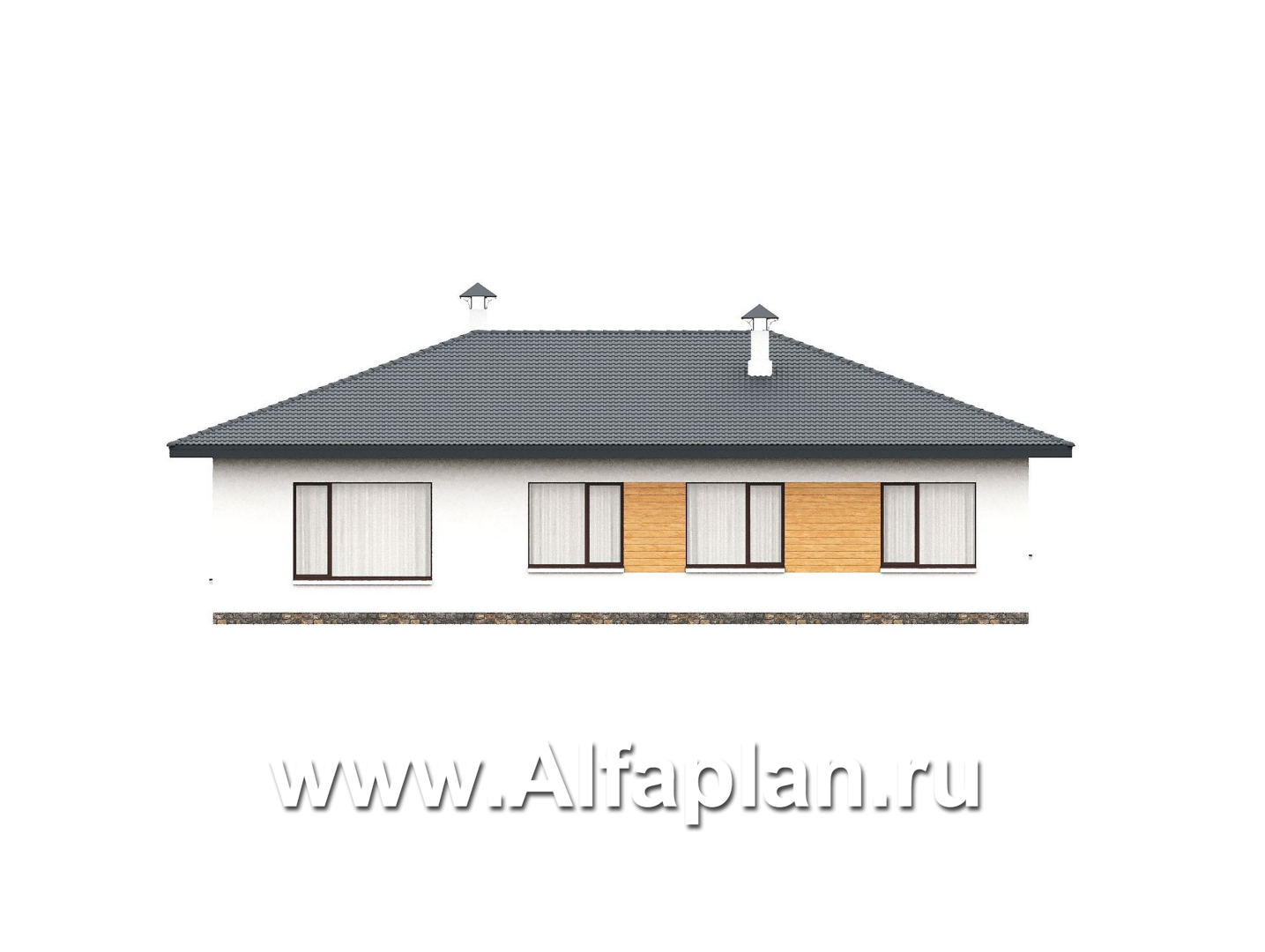 «Serenity» - проект одноэтажного дома, терраса со стороны входа, планировка мастер спальня, 4 спальни