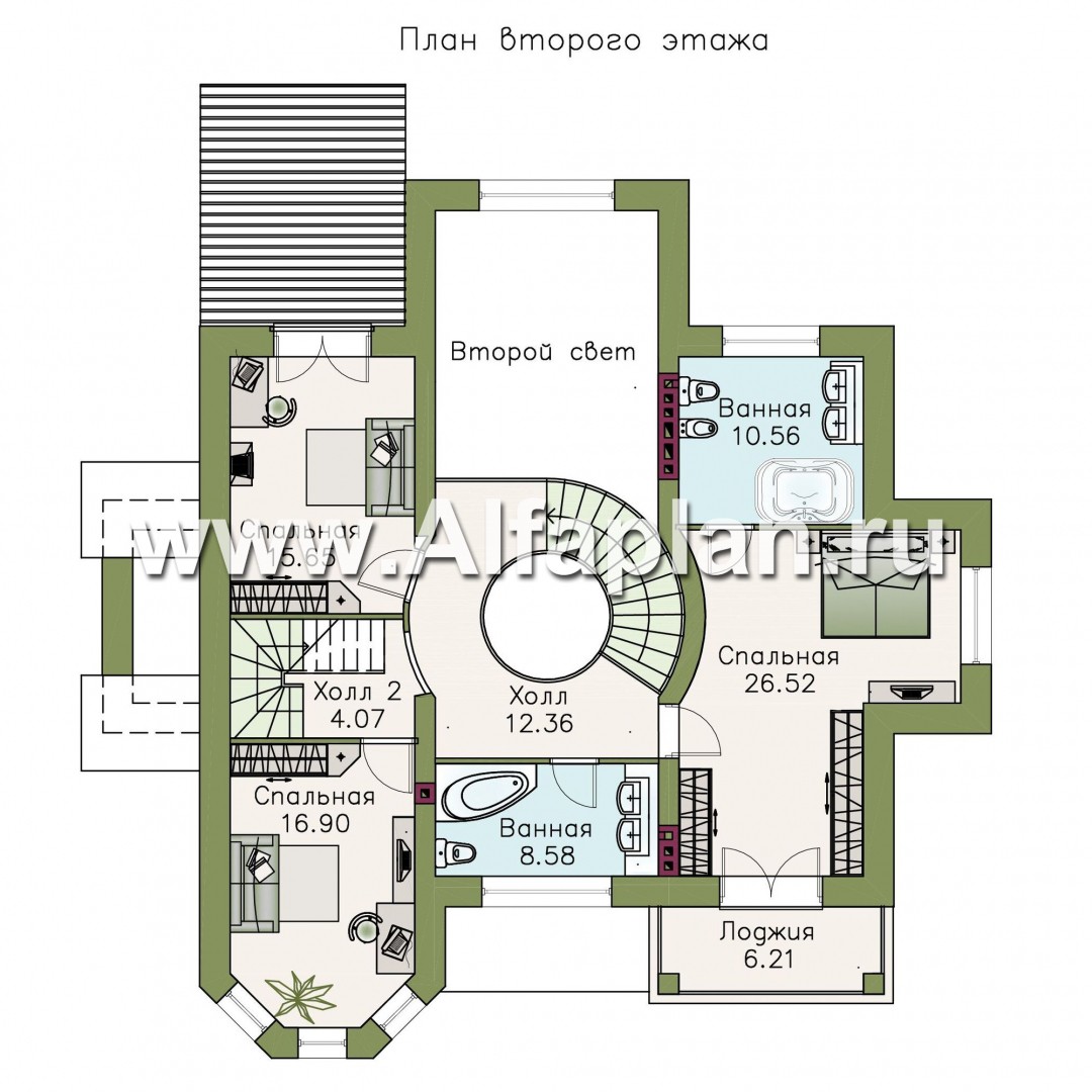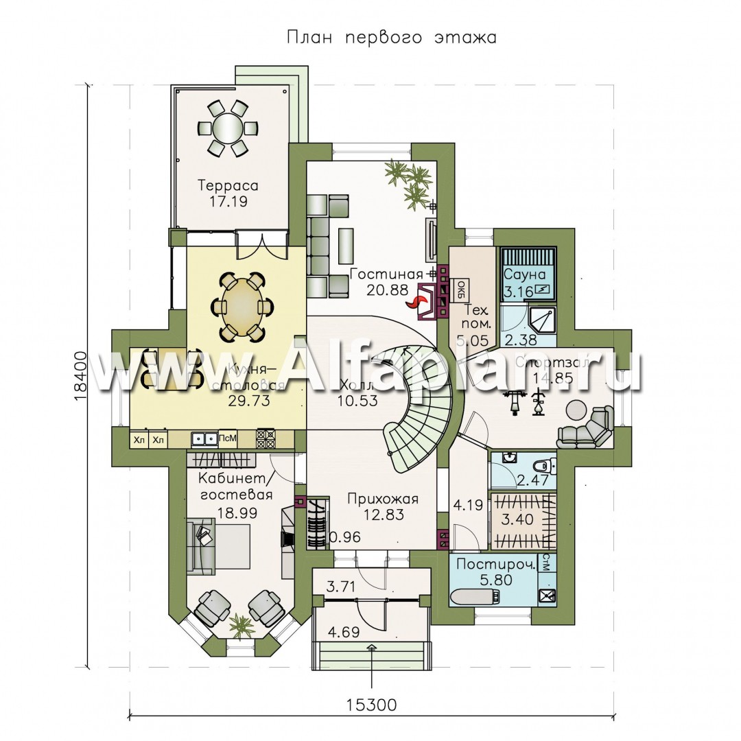 На первом этаже она украшает собой гостевое пространство, на втором — формирует холл спальной зоны. Первый этаж — это репрезентативная часть дома, место приема гостей, общения семьи. Для  этого предоставлено максимум возможностей. Гостевая часть решена в свободной манере, гостиная, кухня, столовая, холл объединены в одно большое, светлое пространство площадью более 70 м2. Гостиная двусветна. В этой части дома находится и кабинет, и гостевая.  Левая часть этажа отдана техническим помещениям и зоне SPA с сауной и комнатой отдыха. Второй этаж — приватная часть дома. Планировка также комфортна и не менее изыскана. Лестница, обрамляя круглое окно второго света, ведет в холл. Большая по площади  спальная комната  сблокирована с просторной ванной комнатой и имеет балкон. Для двух других  спальных комнат  предусмотрена еще одна ванная. Деревянная лестница с забежными ступенями ведет на мансарду. Здесь расположился большой светлый холл. Это помещение можно использовать как бильярдную, кинозал  или студию. Такой дом — престижное и удобное жилье для успешных людей. А проект по объемно-планировочному решению и составу документации не уступает  дорогостоящим   индивидуальным  проектам.  Обратите  внимание, что вы имеете возможность провести объемный просмотр внутренних помещений дома ( так называемая  виртуальная  прогулка ).