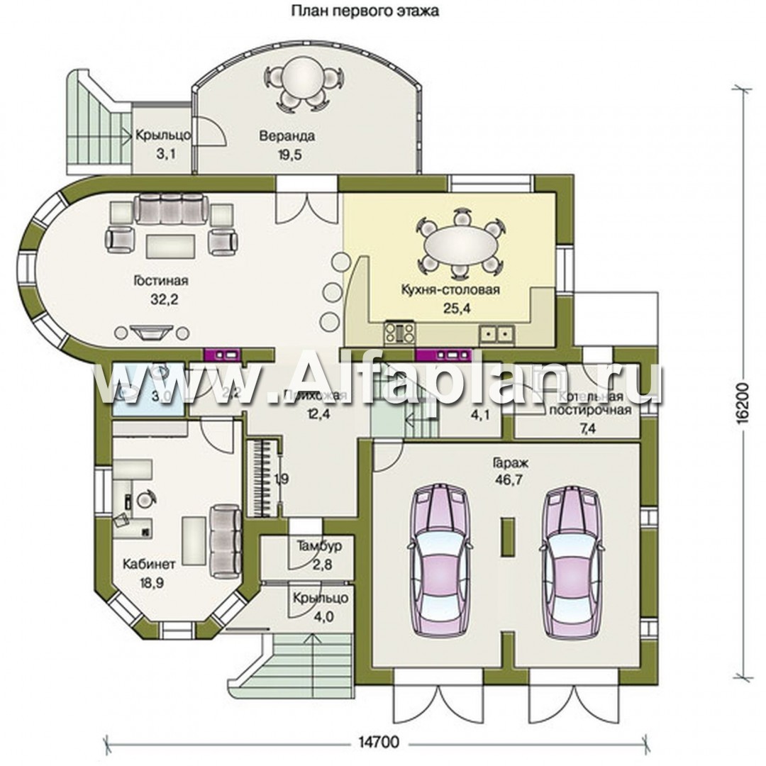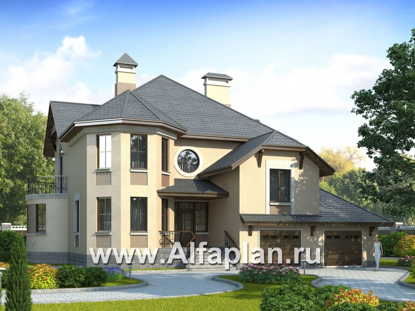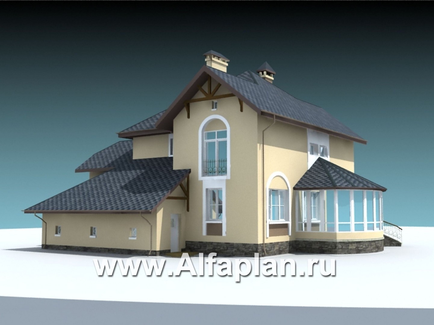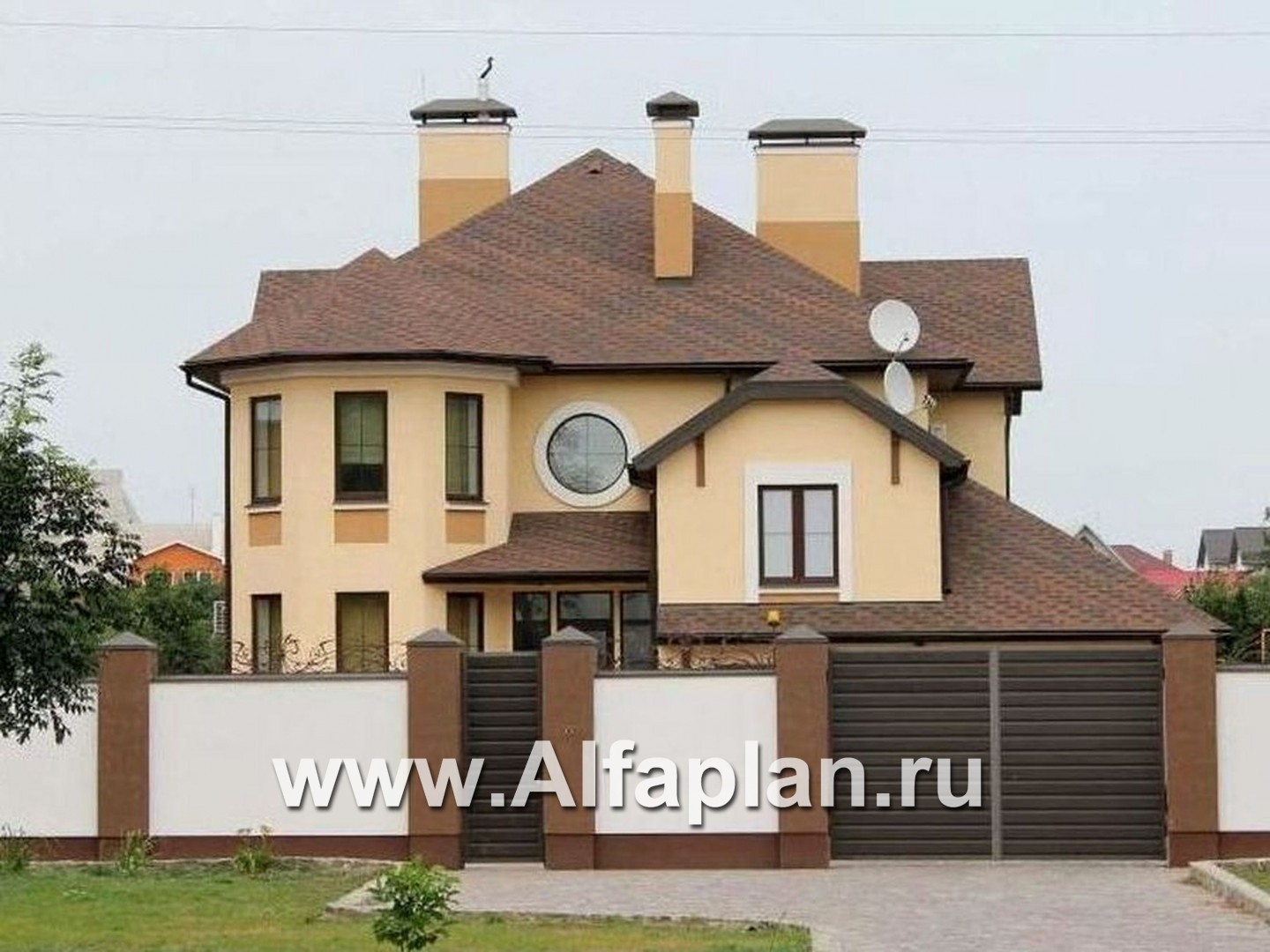 Проект коттеджа отличается красивой компоновкой фасада с перепадом уровней окон. На первом этаже гостиная и столовая-кухня представляют собой единое, перетекающее пространство. Гостиная украшена камином и полукруглым эркером, и имеет прямой выход на веранду. На первом этаже располагается также кабинет, на полэтажа ниже - тех. помещение/ постирочная и гараж. На втором этаже запроектированы четыре спальных комнаты. Одна из спальных имеет выход на балкон,  вторая оснащена французским балконом. Спальня, расположенная над гаражом, оборудована душевой. Чердак гаража используется как холодная кладовая.