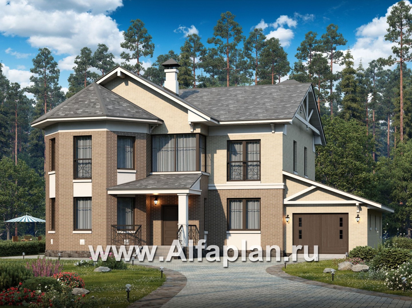 «Clever» - проект двухэтажного дома, планировка с эркером и кабинетом на 1 эт, с террасой и с гаражом