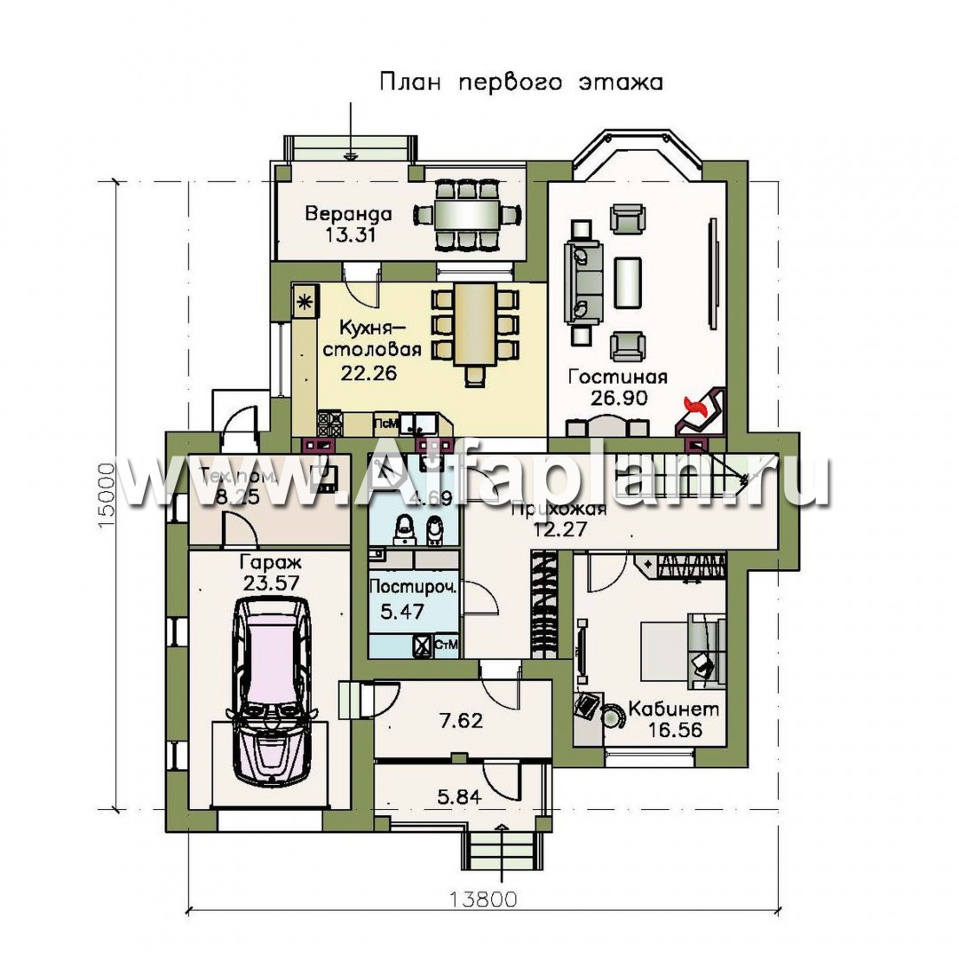 «Белоостров» - проект двухэтажного дома, планировка с кабинетом на 1 эт, с террасой и с гаражом на 1 авто