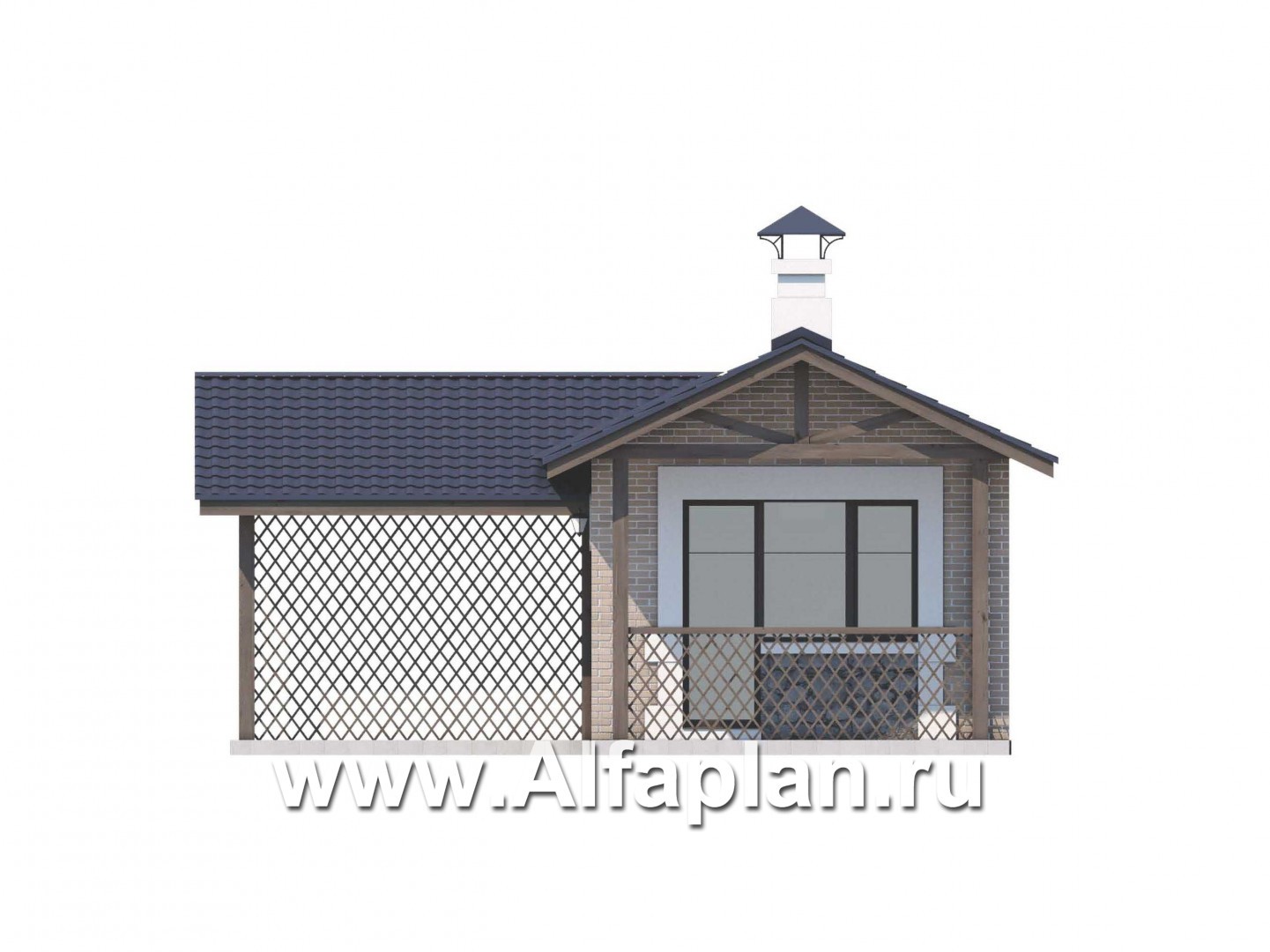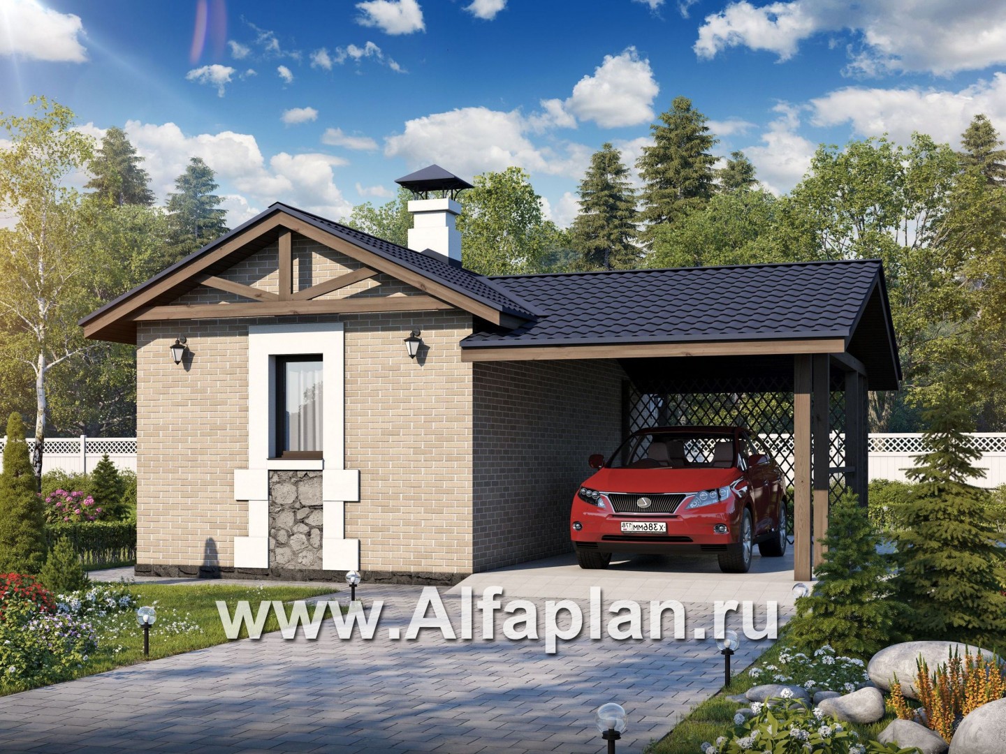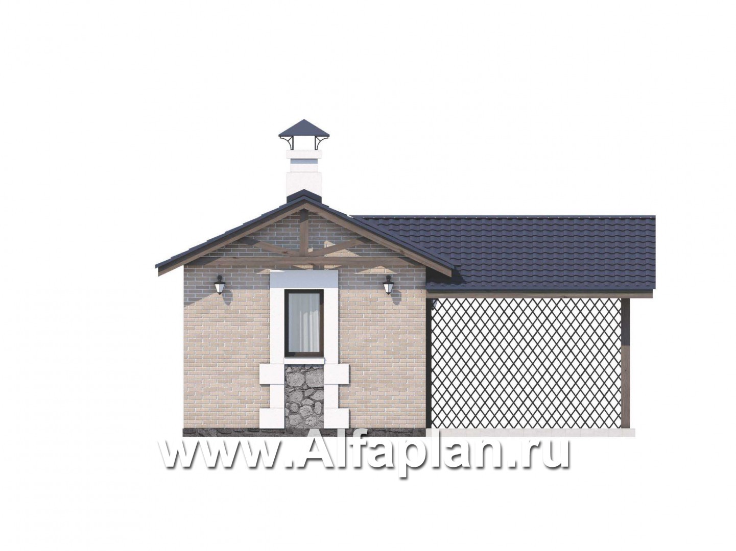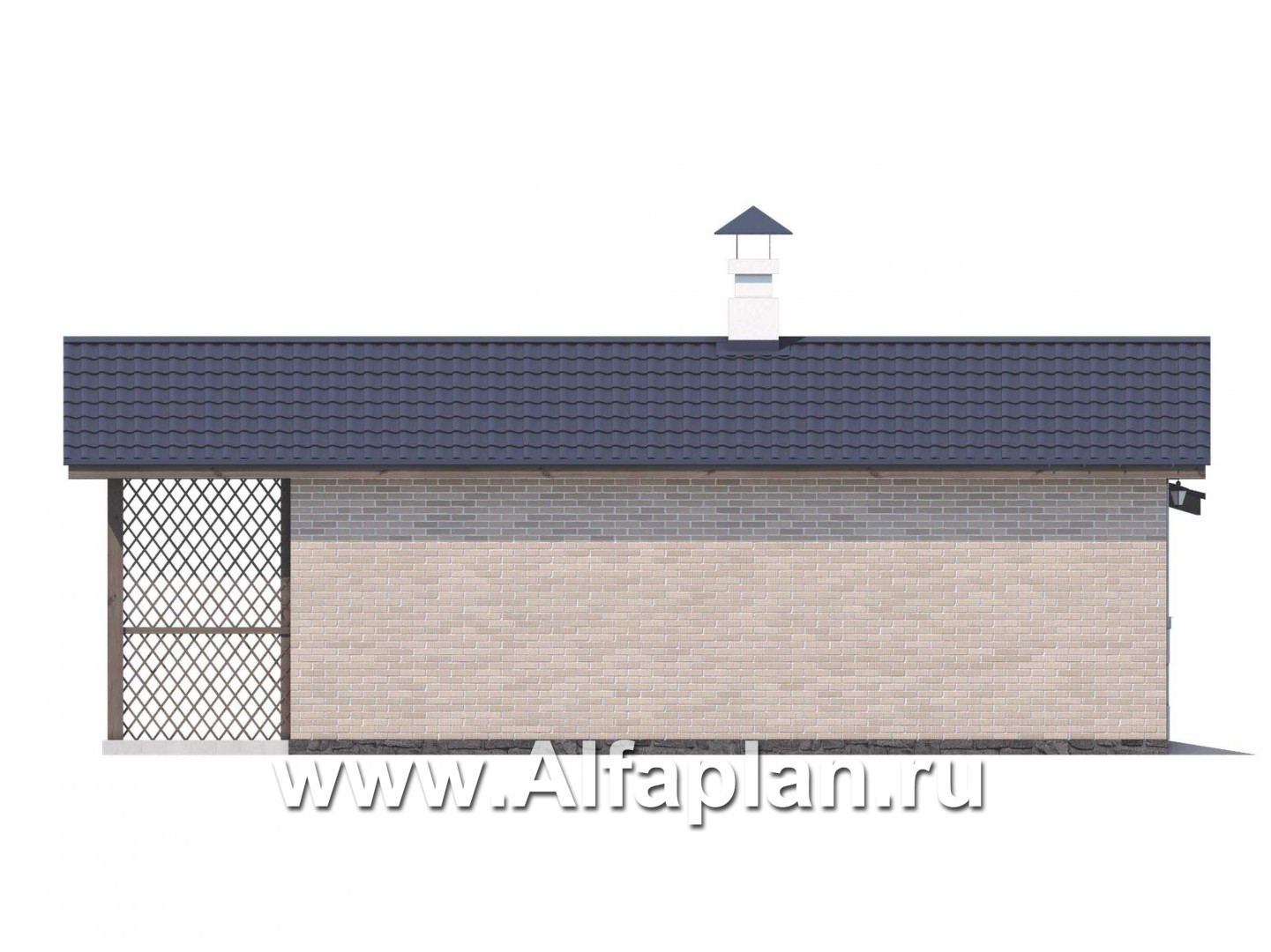 Баня с комнатой отдыха и навесом для машины подходит для небольшой усадьбы. Общая площадь вместе с уличной частью составляет 40 м2, жилая – 24 м2. Внешняя отделка выполнена из декоративной штукатурки с имитацией кирпича. Навес, дровник и веранда лаконично декорированы и визуально отделены от участка решетчатыми перегородками.