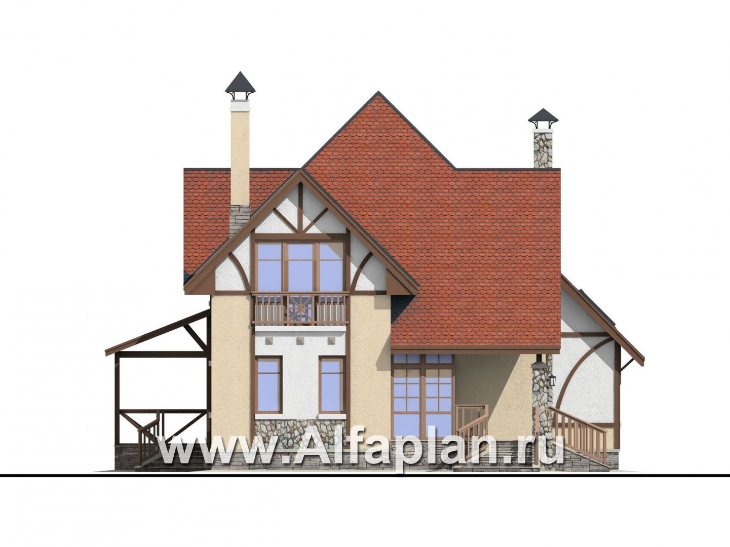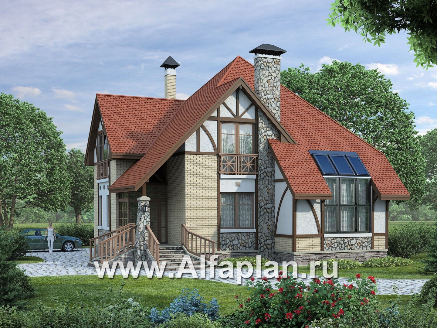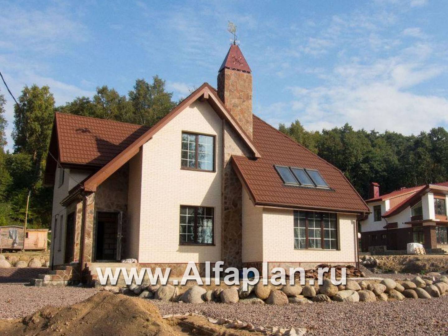 В этом небольшом по площади доме удалось создать просторную, свободную и очень гармоничную среду. Не последнюю роль в этом сыграли мансардные окна. Они не только освещают помещения, но и создают неповторимые интерьерные пространства. Особенно это ощутимо в гостиной и в холле первого этажа. Дополняют все это уютное великолепие французские балконы коттеджа. Монолитная ж/б плита является фундаментом дома. Наружные стены могут быть двух типов – газобетонные блоки или же кирпич. Так что это позволяет нам сказать, что проект относится к категории «кирпичные и газобетонные дома». Экстерьер дома создает впечатление того, что дом под номером 66А – это уютный и теплый семейный очаг, объединяющий членов семьи в небольшое, но очень комфортное пространство. Внешне дом содержит даже некоторую красочность, проявляющуюся в декоративном фахверке, а также во вкраплениях в наружные стены красивой наружной отделки искусственным камнем. Искусственный камень также прекрасно смотрится на дымовых трубах дома и низкой колонне крыльца с невысокими, удобными лестницами.