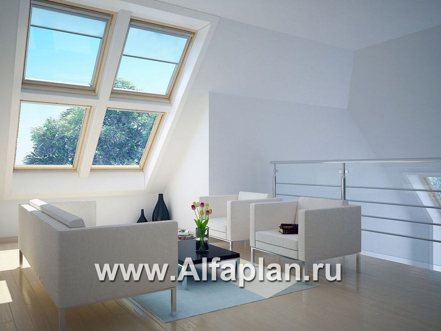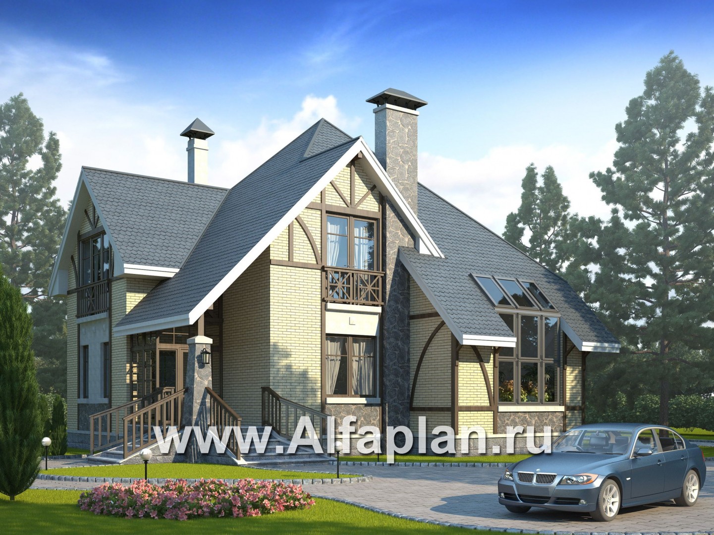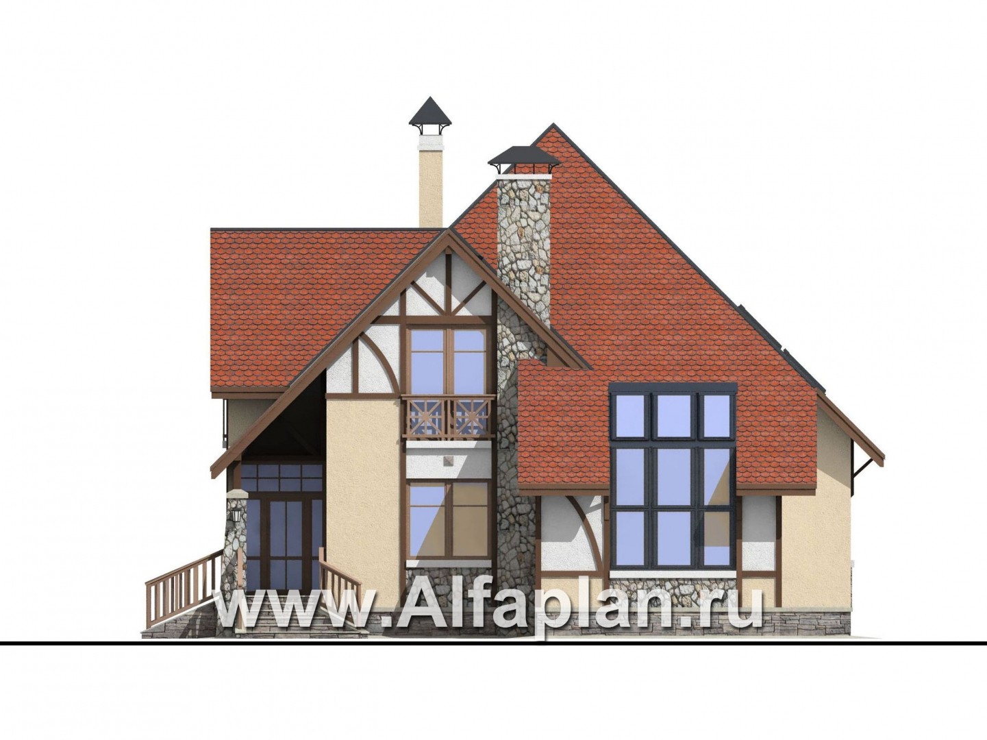 В этом небольшом по площади доме удалось создать просторную, свободную и очень гармоничную среду. Не последнюю роль в этом сыграли мансардные окна. Они не только освещают помещения, но и создают неповторимые интерьерные пространства. Особенно это ощутимо в гостиной и в холле первого этажа. Дополняют все это уютное великолепие французские балконы коттеджа. Монолитная ж/б плита является фундаментом дома. Наружные стены могут быть двух типов – газобетонные блоки или же кирпич. Так что это позволяет нам сказать, что проект относится к категории «кирпичные и газобетонные дома». Экстерьер дома создает впечатление того, что дом под номером 66А – это уютный и теплый семейный очаг, объединяющий членов семьи в небольшое, но очень комфортное пространство. Внешне дом содержит даже некоторую красочность, проявляющуюся в декоративном фахверке, а также во вкраплениях в наружные стены красивой наружной отделки искусственным камнем. Искусственный камень также прекрасно смотрится на дымовых трубах дома и низкой колонне крыльца с невысокими, удобными лестницами.