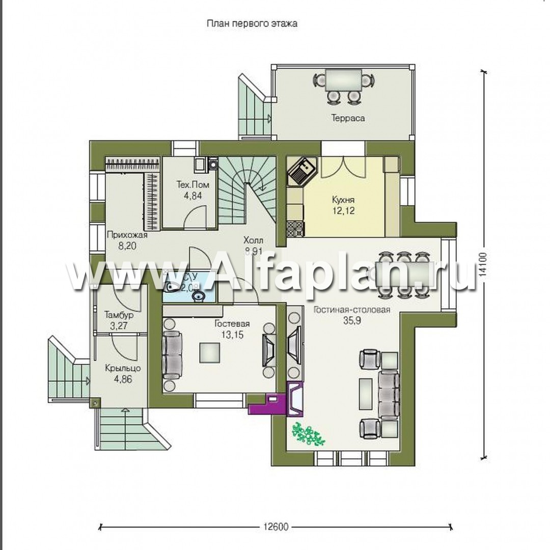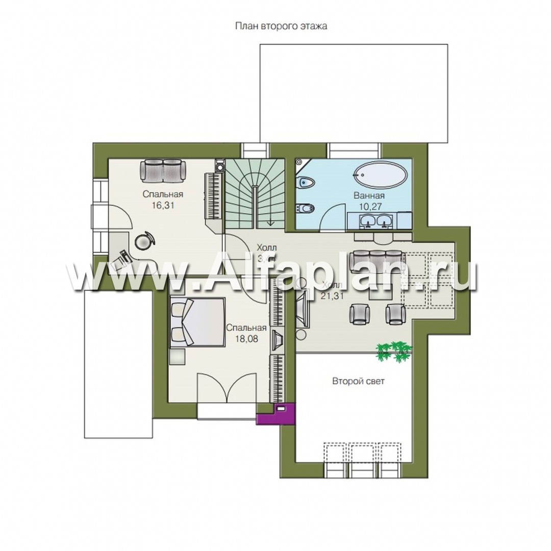 Гостиная - двусветное пространство, мансардные окна которого делают его самым светлым помещением в доме. Особого внимания заслуживает и планировка дома в целом. К ее несомненным достоинствам относится небольшая гостевая комната и удобная светлая прихожая на первом этаже. Владельцы дома по достоинству оценят и террасу, выйти на которую можно прямо из кухни, сопряженной в единое пространство с гостиной-столовой. Также имеется техническое помещение, примыкающее к лестнице в холле, занимающем центральное положение на первом этаже. Фасадный входной блок просторен и состоит из тамбура и, конечно же, крыльца. Интересно решение и мансардного этажа. Здесь расположены две спальни, просторная светлая ванная комната и просторный холл. Большая площадь, отличное освещение (мансардными окнами) позволяют разместить здесь вторую гостиную дома.