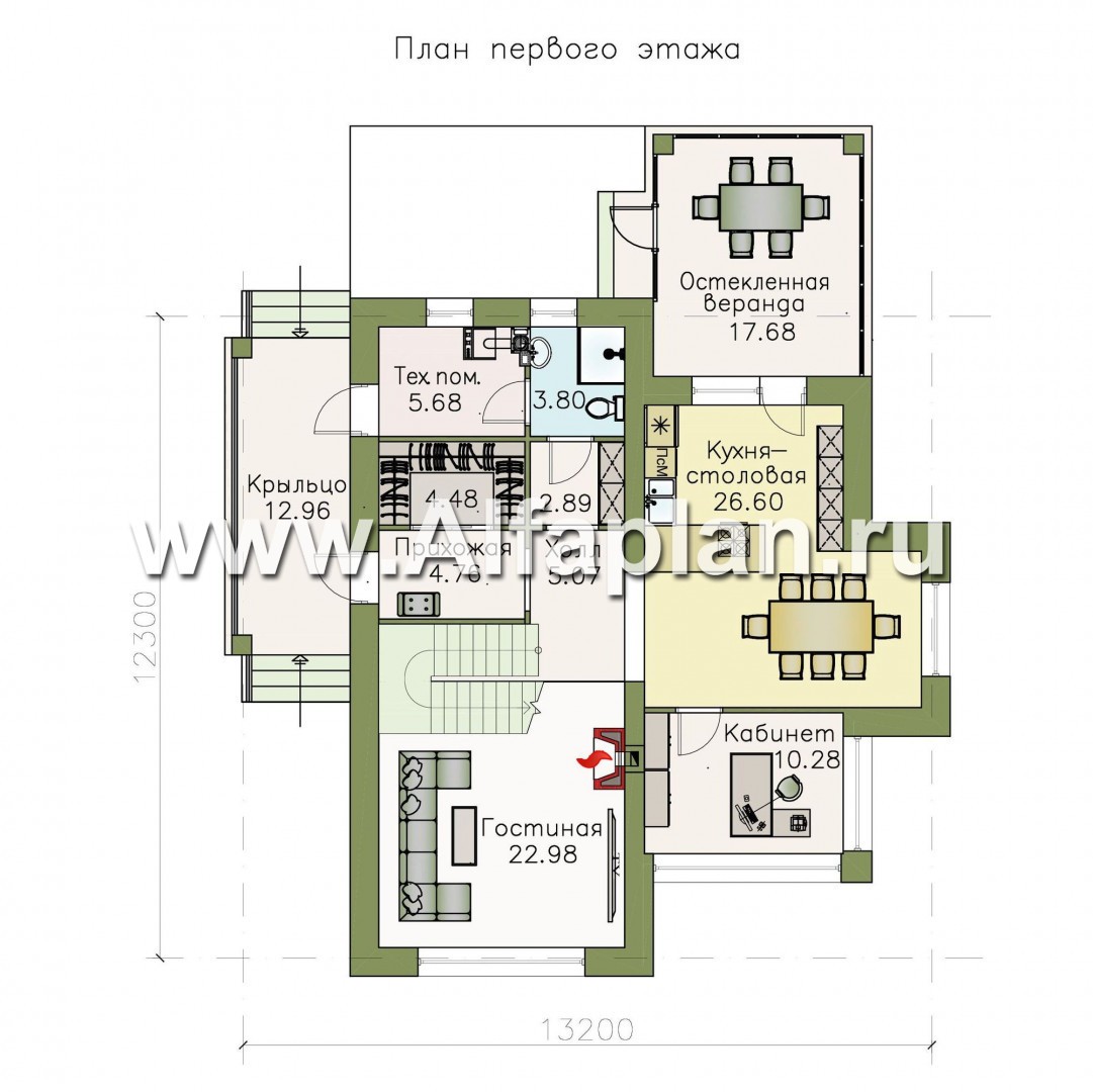 На просторное крытое крыльцо можно попасть с двух сторон, после чего через входную дверь открывается вход в прихожую с изолированной гардеробной комнатой и открытый проход в холл, совмещенный с гостиной. В ней находится камин, большое панорамное окно и лестница на второй этаж. Совмещенная кухня-столовая позволяет попасть в изолированный кабинет с двумя окнами и в остекленную веранду по другую сторону здания. Из холла также открывается проход во вспомогательное помещение с дверью в санузел, а затем – в котельную. Из нее предусмотрен второй выход на крыльцо.