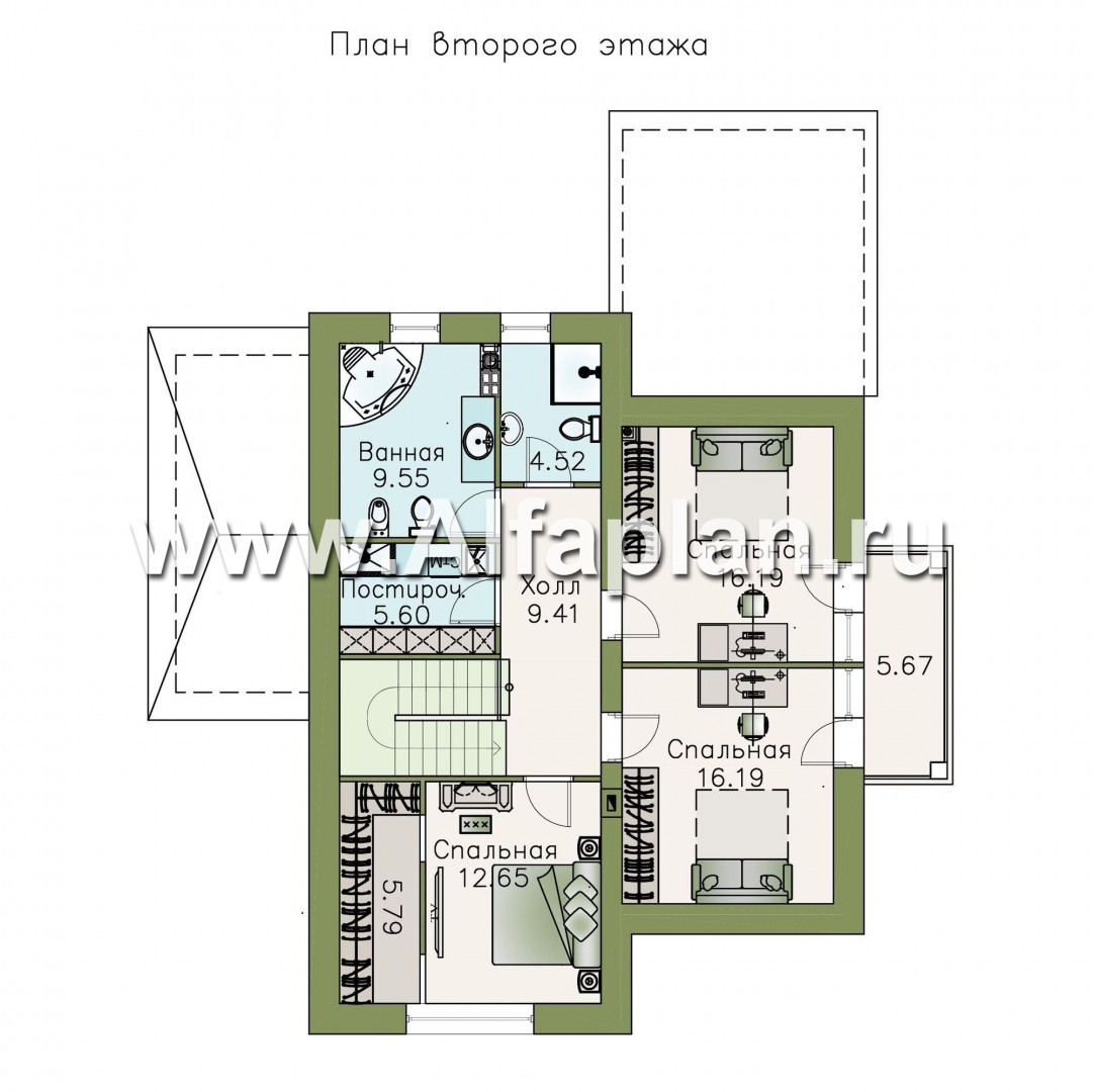 Проекты домов из кирпича (газобетона) данной серии предусматривает комфортную планировку мансардного этажа с большим холлом, обширной спальней с балконом и второй спальней, находящейся сразу рядом с лестницей. Из холла второго этажа три двери ведут в отдельные помещения: туалет, ванную комнату с душевой кабиной, помещение для стирки.