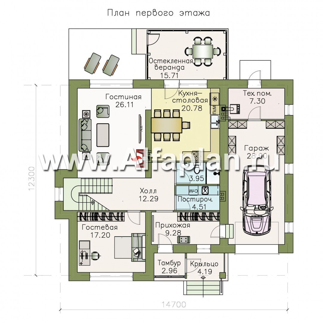 Обратите внимание: внутри дома нет площади, которая не несла бы какое-то значение. Даже лестница, расположенная в холле, не является препятствием для перемещения даже большого количества людей.