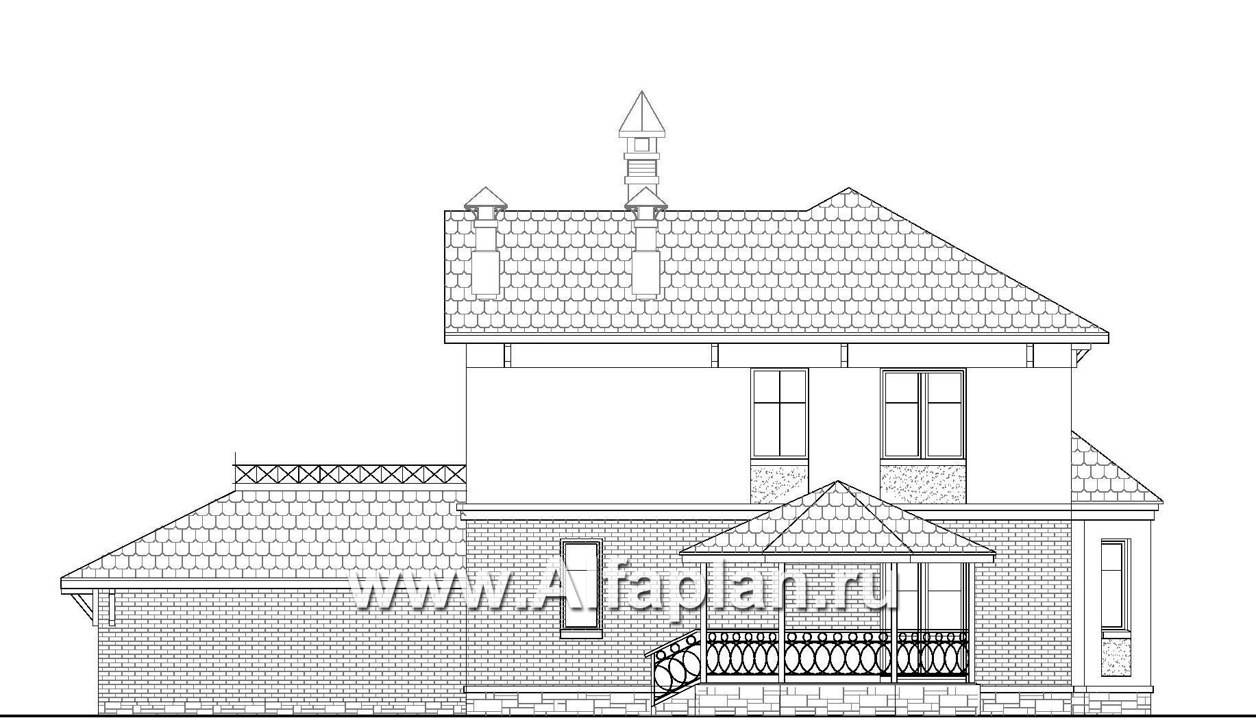 Двухэтажный загородный дом с массивным эркером и гаражом для двух автомобилей привлечет внимание заказчиков, стремящихся построить дом, не подвластный веяниям быстротечной моды.  Его "спокойная" архитектура,  классические элементы декора: карнизы, кронштейны, решетки ограждений создают ощущение стабильности и незыблемости  традиций.  Несомненным украшением главного фасада является эркер, проходящий  через оба этажа. Большие вертикальные  окна прекрасно освещают внутренние помещения. Главный вход находится  в левой  части  строения. Ступеньки входа и цоколь дома отделаны  облицовочным камнем.