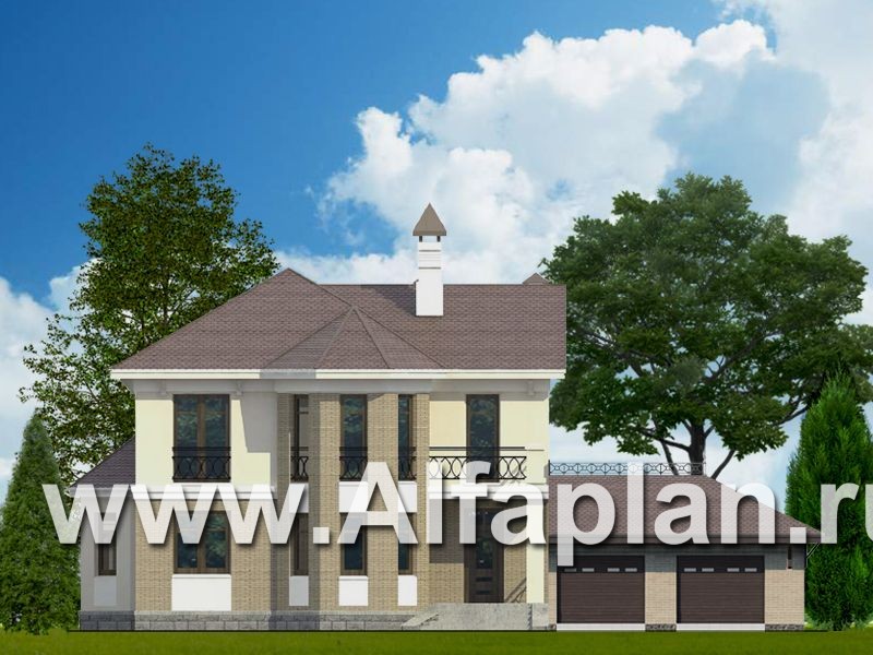 111E-S «Классика» - проект двухэтажного дома с эркером и с балконом, с гаражом на 2 авто