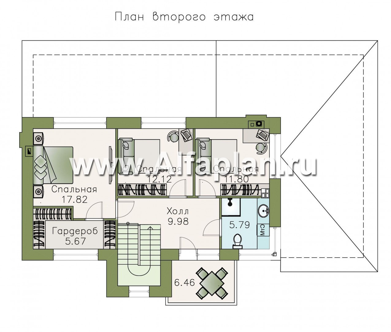Второй этаж занимают три спальни, одна из которых совмещена с гардеробом. Данный проект дома предполагает наличие на втором этаже просторного и светлого холла. Из него можно попасть в санузел и на открытый балкон, служащий в летнее время года удобной зоной для уединения или чтения любимой книги.