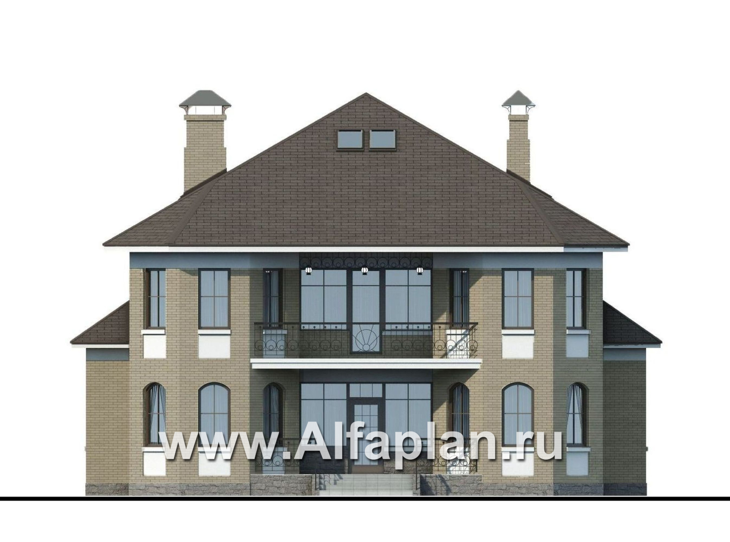 Автор этого проекта дома из кирпича (газобетона) лишь в одном отступил от классических традиций – он отказался от строгих четырехугольных форм. Основу главного фасада составляют два массивных многогранных эркера: именно благодаря им постройка выглядит удивительно современно. Кстати, эркеры превратили балкон, расположенный над главным входом, в лоджию – еще один непривычный для классики архитектурный элемент.
