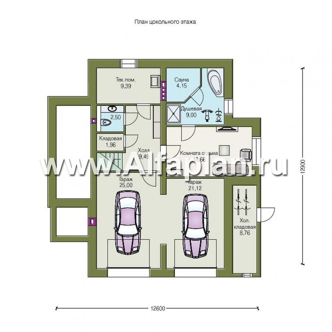 В цоколе, помимо двухместного гаража, размещены также: