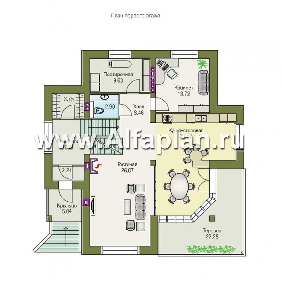 На чертежах первого этажа показано, что большую его часть занимает объединенное пространство гостиной и кухни-столовой, обогреваемое дополнительно большим натуральным камином. Эти комнаты можно также разграничить зрительно разнообразными дизайнерскими методами — стеклянной стеной, складчатой перегородкой и другими, а можно оставить одним объемом, соблюдая зонирование. Уединенно расположен рабочий кабинет, при желании его можно назначить гостевой или детской. В холл выходят постирочная и санузел.