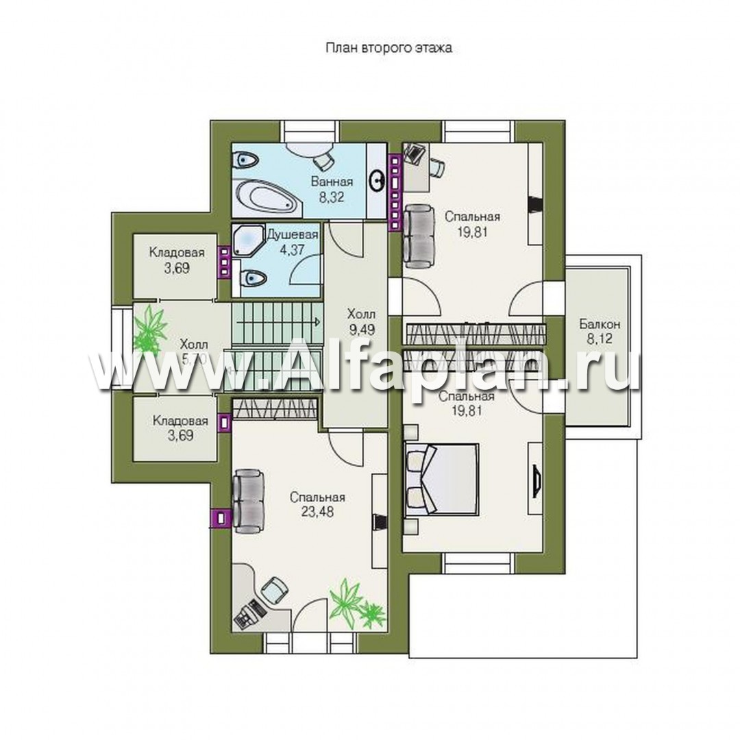 Второй этаж – это ночная зона. Три спальни выходят в холл, где есть душевая и ванная для общего пользования. Одна из комнат имеет площадь 24 м² и предназначается для гостей, две остальные, равные по площади (20 м²), имеют выход на балкон. В холле, расположенным за лестничным маршем, обустроены две кладовые по 4 м², они могут иметь разнообразное назначение.