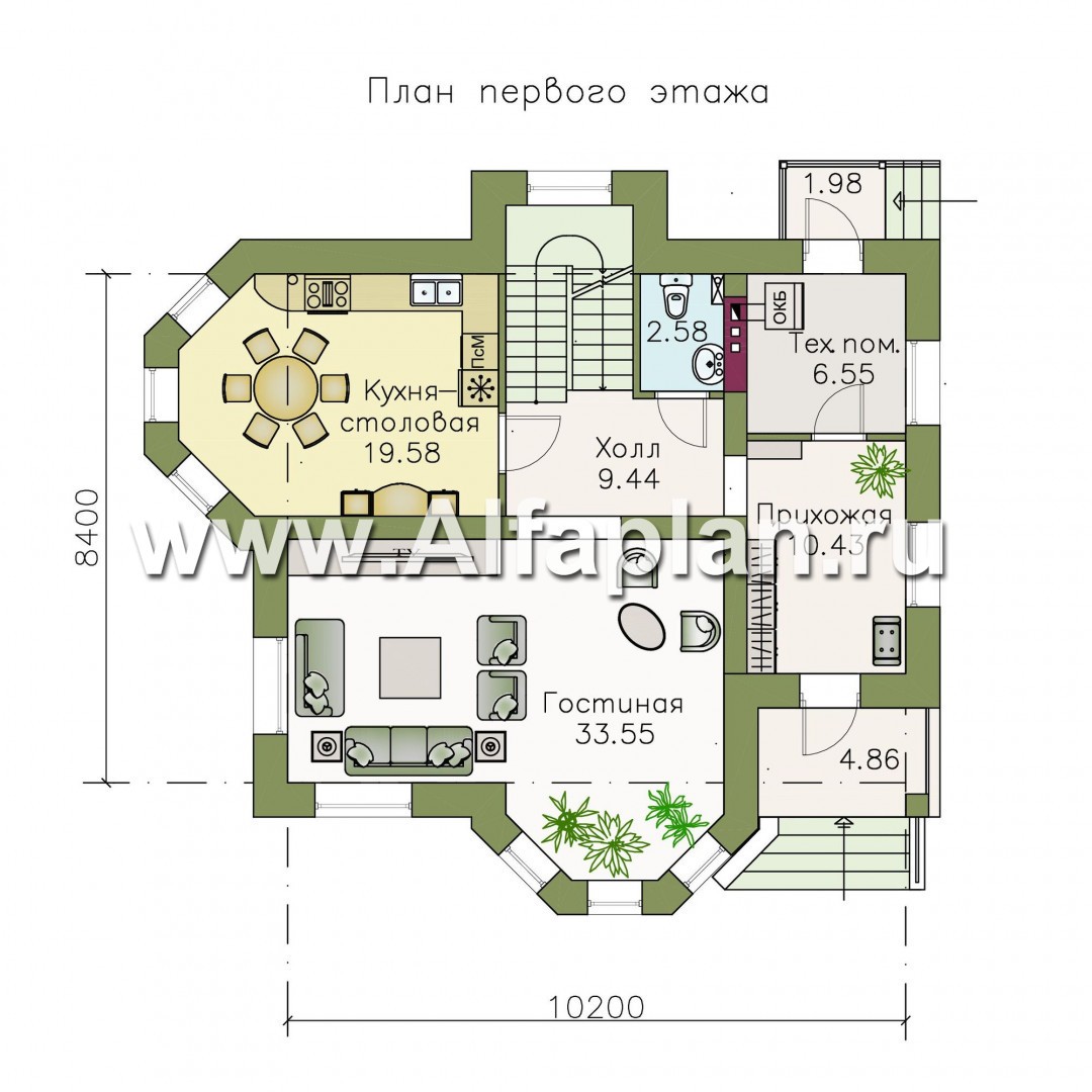 В дом попадаем через входную дверь, перед которой проектировщики разместили небольшое уютное крыльцо. Сразу же оказываемся в большой по площади прихожей. Напротив — компактное технические помещение, через которое можно выйти во двор через задний выход. Если свернуть направо, оказываемся в холле с лестницей на 2 этаж, рядом с которой расположен санузел. Из холла, если пойти прямо, попадаем на кухню, совмещенную со столовой. Если повернуть налево, оказываемся в большой гостиной с эркером.