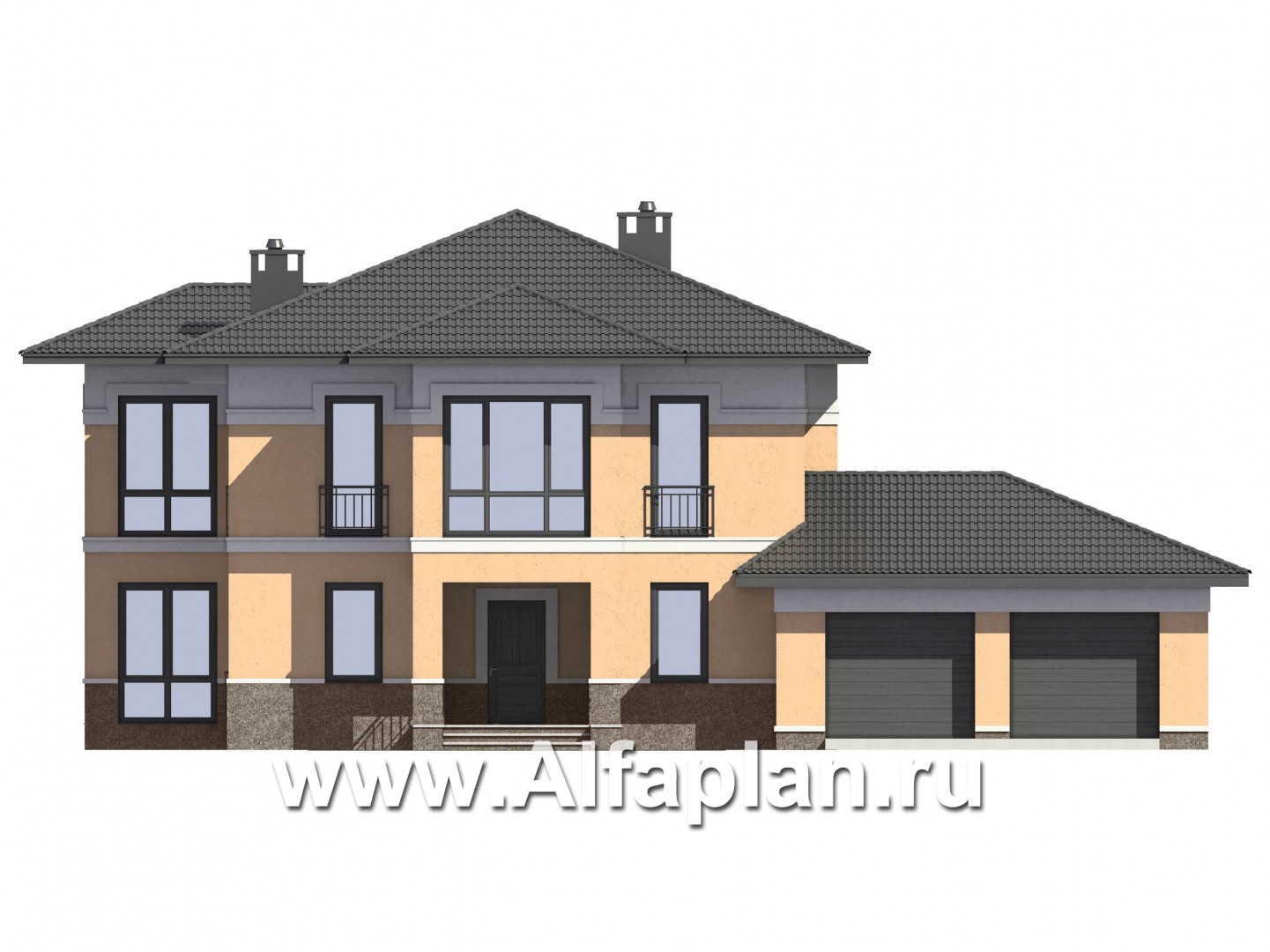 Проект двухэтажного дома из газобетона, планировка с гостевой и спальней на 1 эт, с террасой и с гаражом на 2 авто, в современном стиле