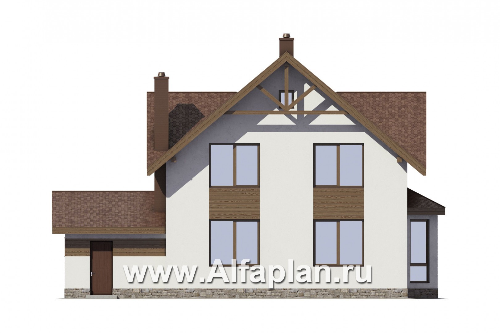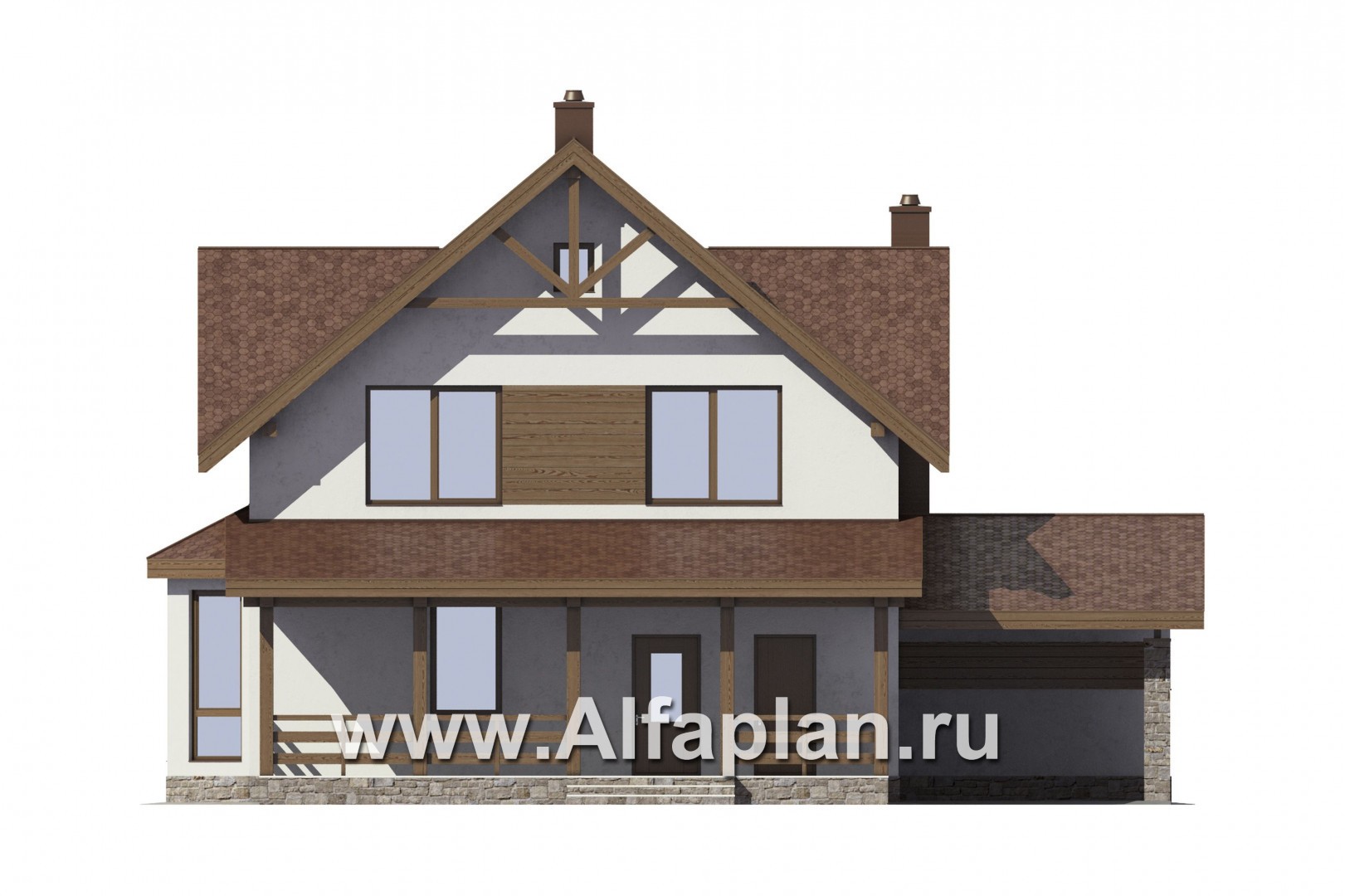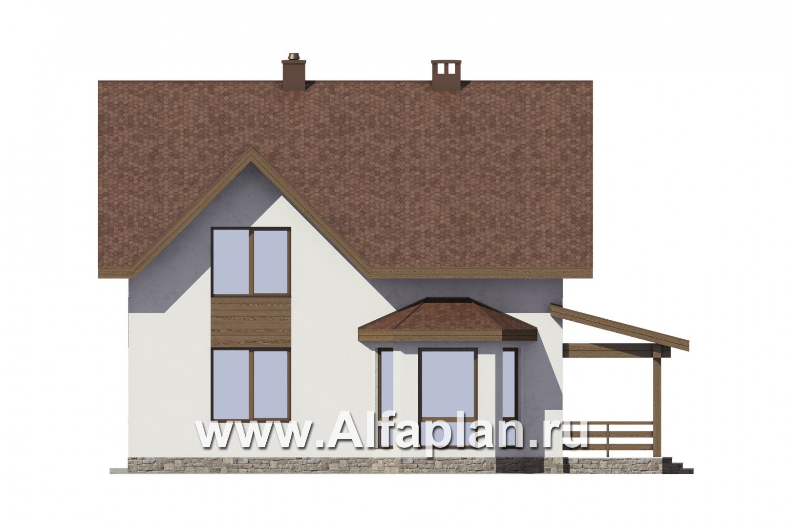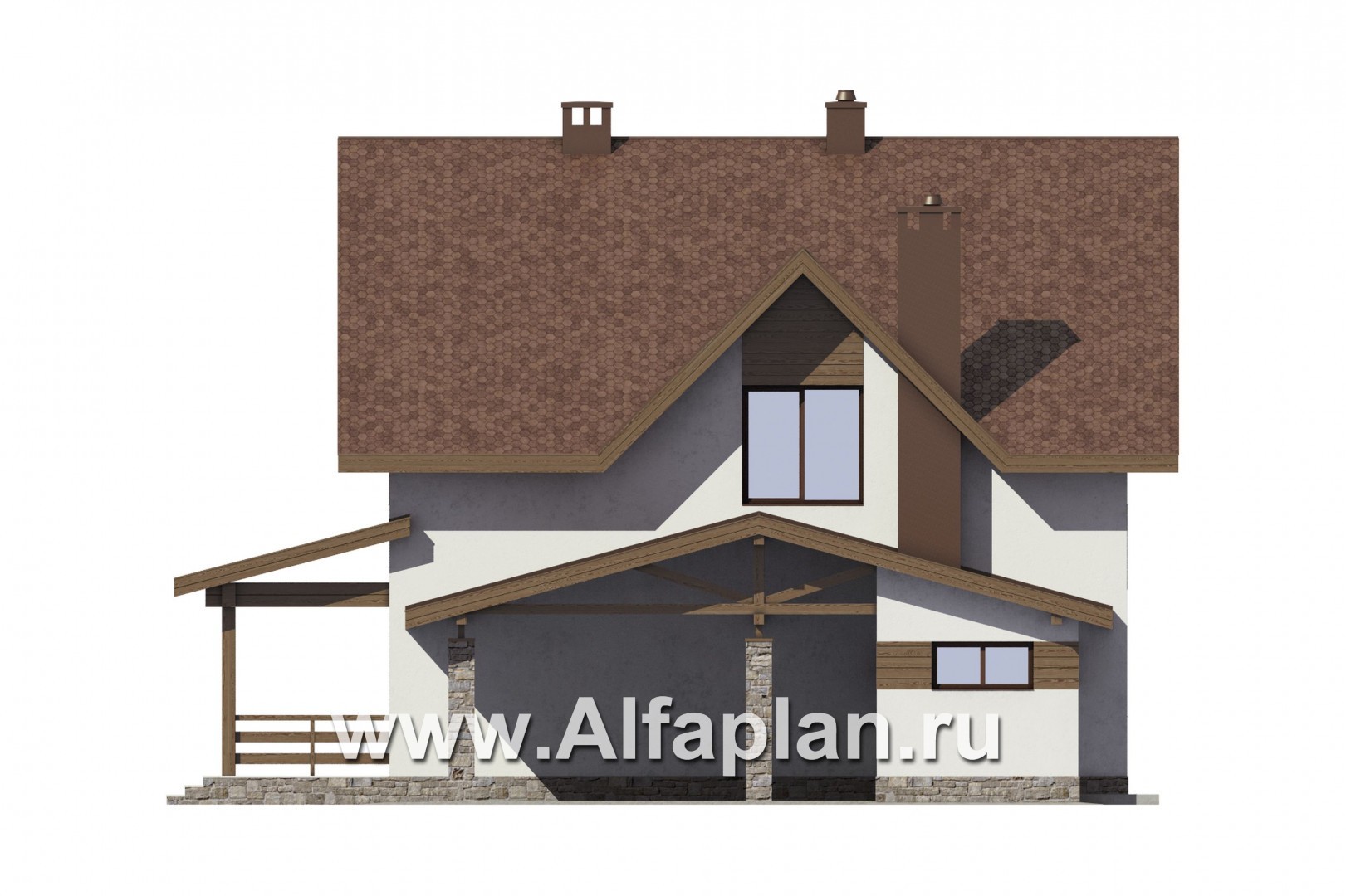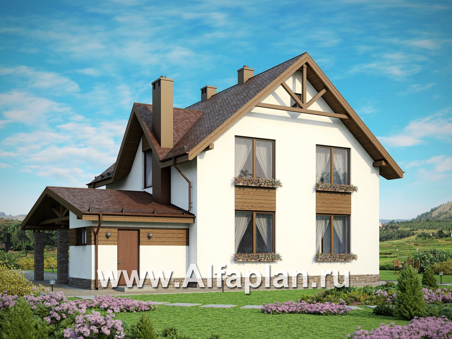 Проект дома с мансардой, 3 спальни, с камином и эркером, гостевая комната на 1 эт, терраса со стороны входа, навес на 1 авто