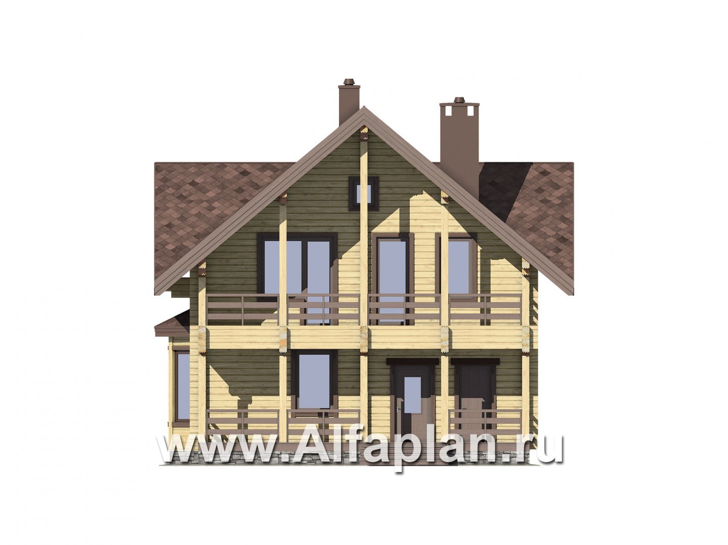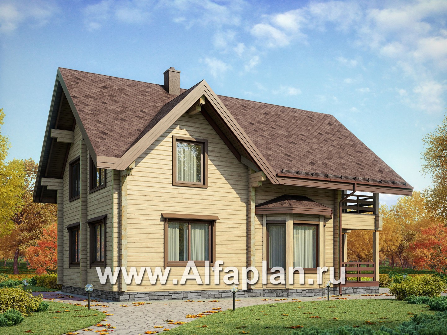 G90b Проект двухэтажного дома из бруса, планировка с кабинетом и с эркером, терраса и балкон со стороны входа