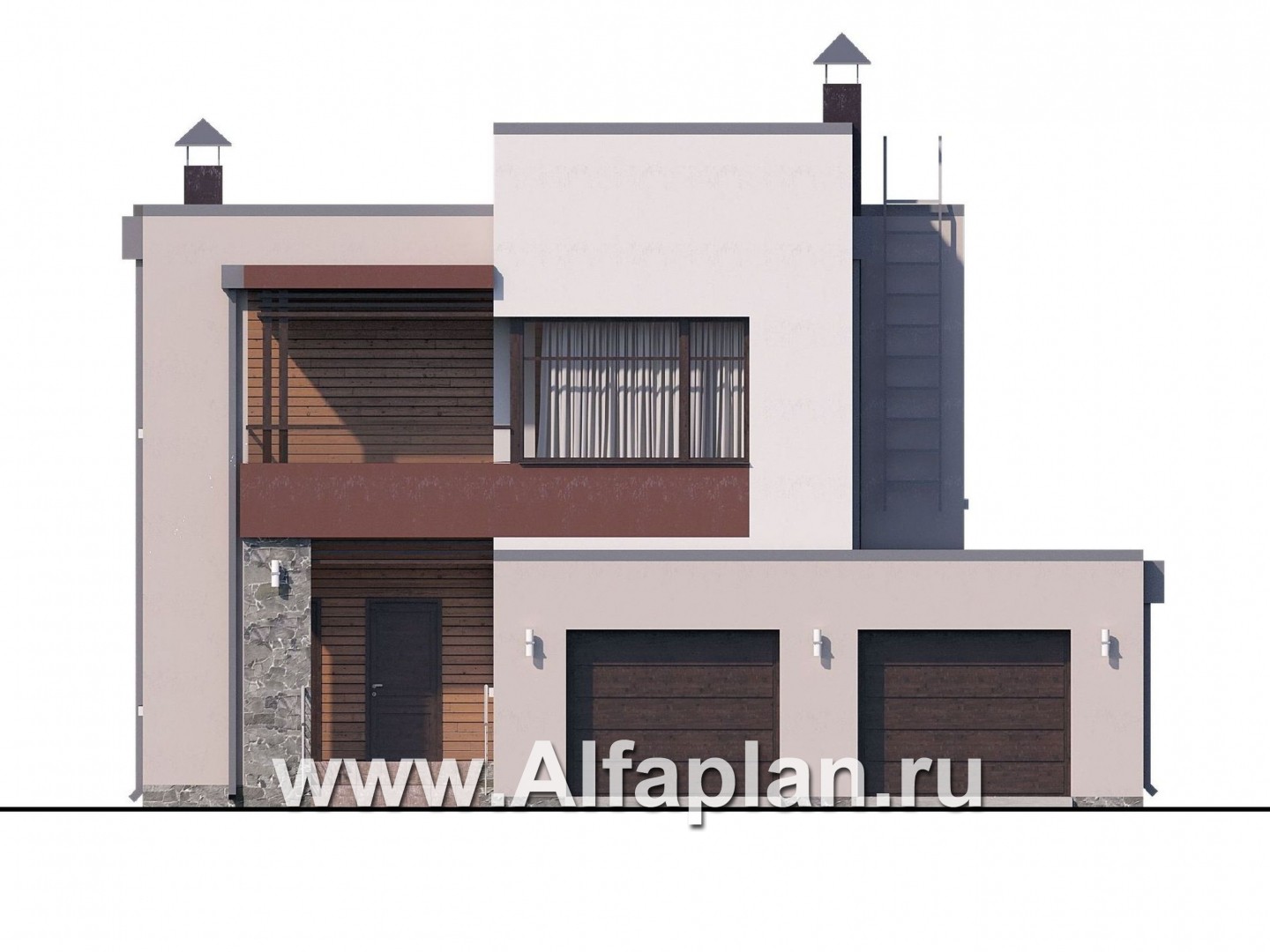 «Эвр» - проект двухэтажного дома с террасой и с гаражом на 2 авто, лестница в гостиной, с плоской кровлей, в стиле хай-тек - технические характеристики