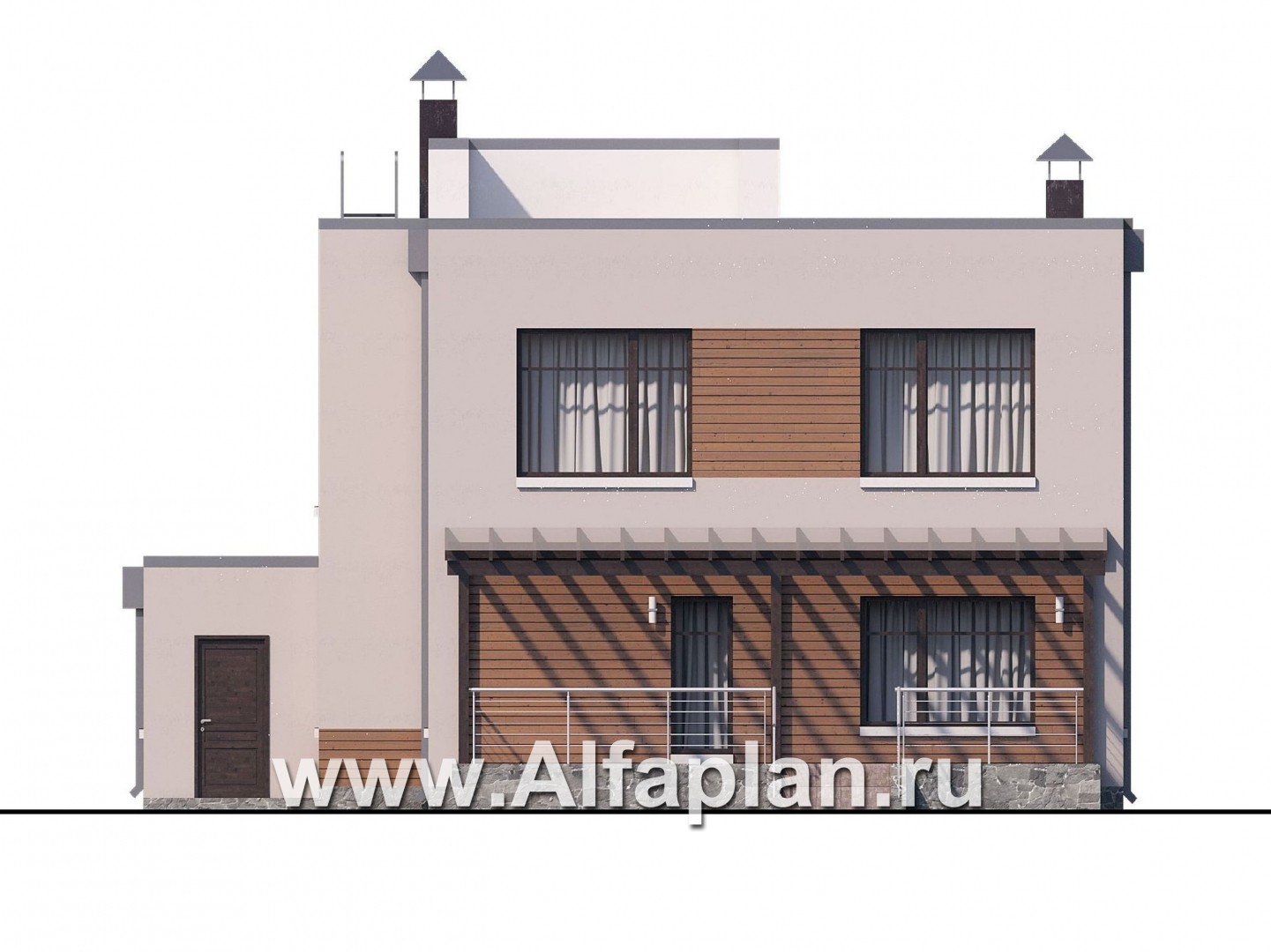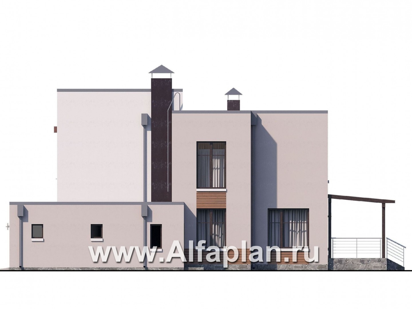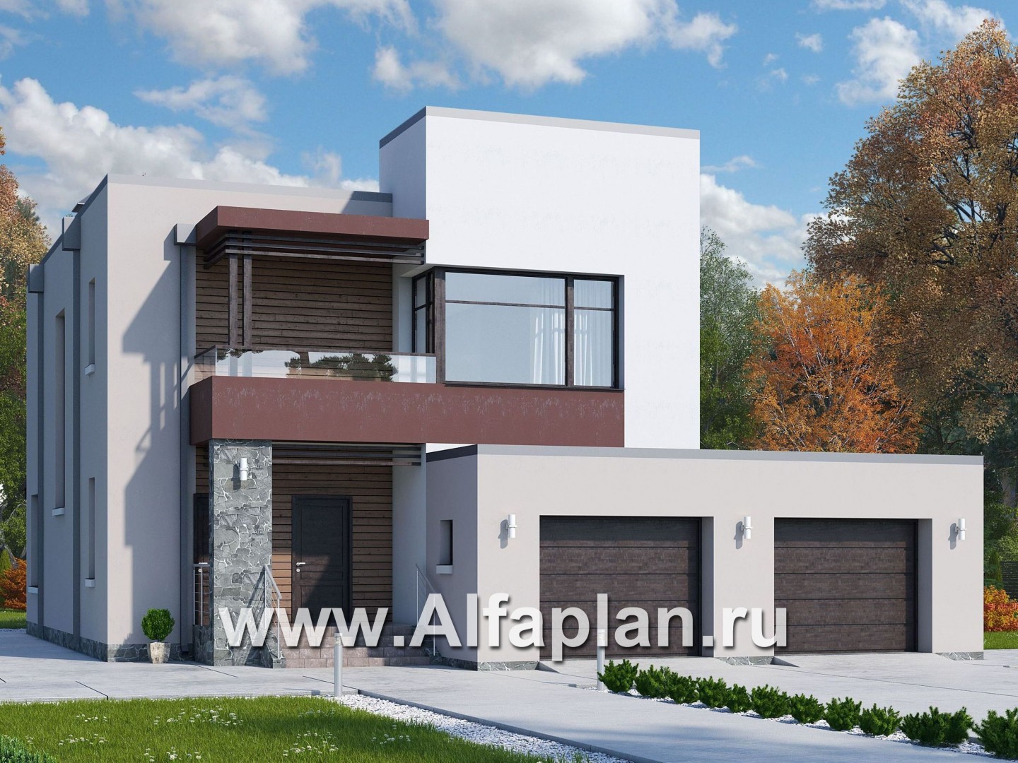 Плоские крыши домов сегодня в моде. Так почему бы не обратить внимание на большой современный коттедж с плоской крышей, большой крытой трассой и пристроенным гаражом для двух машин?