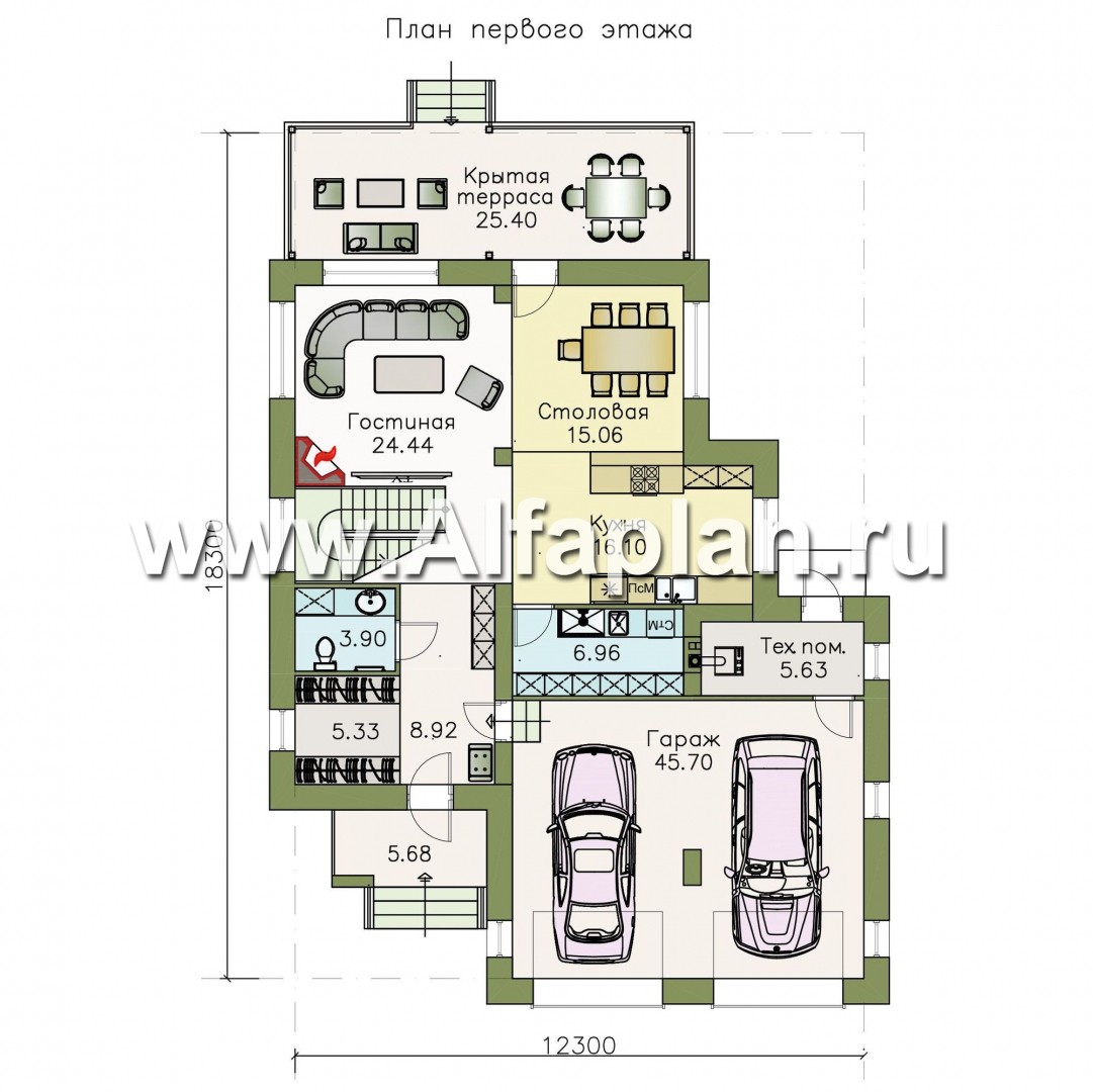 Дом спроектирован с расчетом на проживание в нем большой семьи. Первый этаж состоит из одной жилой комнаты – гостиной. В этом просторном помещении предусмотрен теплый камин, который обязательно согреет в холодные зимние вечера. Из прочих помещений на первом этаже есть столовая и кухня, из которой можно выйти на крытую террасу, расположенную в тыльной части дома.
